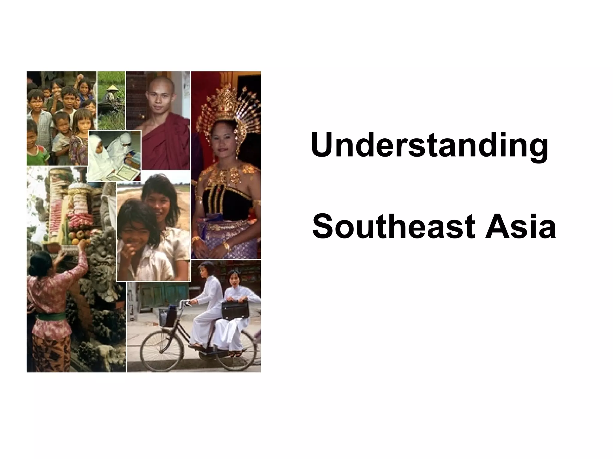 This document proposes a module to promote understanding of Southeast Asia. It provides an overview of the region, including its diversity, population of over 500 million across 11 countries, and various ethnic groups and languages. A short history notes migration to the region beginning 2500 BCE, along with influences of Hinduism, Buddhism, Islam, and European colonialism. The region experienced decolonization in the mid-20th century and now deals with issues of environment, culture, politics, and economics.