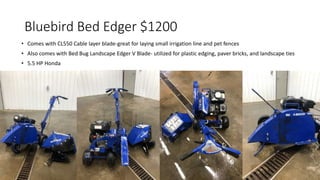 This document lists used equipment for sale or rental from Brainerd General Rental including edgers, power rakes, aerators, sod cutters, jackhammers, paint sprayers, wood chippers, trash pumps, tillers, generators, compactors, rammers, trowlers, drum rollers, trenchers, skid steers, and excavators. The equipment ranges in price from $300 for a trash pump to $22,000 for a large wood chipper and most are powered by Honda or Kohler gas engines.
