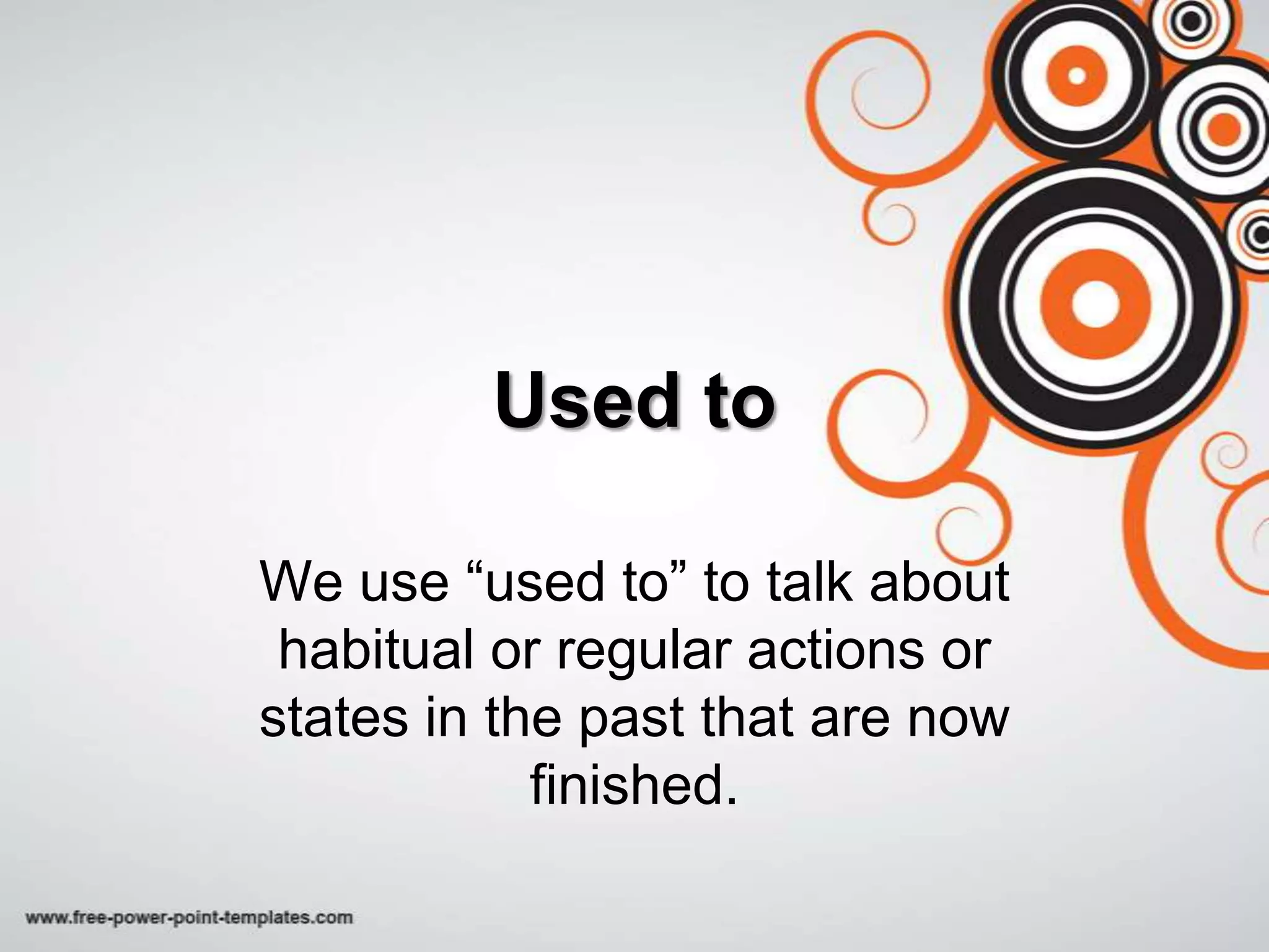 This document discusses how to use the phrase "used to" to talk about habitual or regular past actions that are no longer occurring. Specifically, it provides examples of using "used to" in sentences, shows how to form questions and negative statements, and distinguishes the grammar forms for "used to" versus "didn't use to".