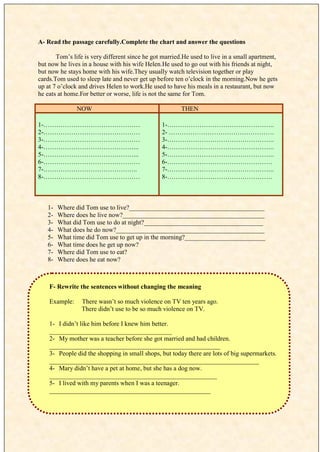 The passage describes changes in Tom's life since getting married. It used to be that Tom lived alone in a small apartment, went out with friends at night, slept late, and had meals in restaurants. Now, since marrying Helen, Tom lives in a house with her. In the evenings he stays home watching TV or playing cards with Helen. He wakes up earlier at 7 am to drive Helen to work and eats meals at home.