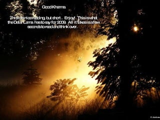 The document provides short pieces of advice from the Dalai Lama for living a meaningful life in 2009. Some of the key advice includes: taking risks but learning from failures, respecting yourself and others while taking responsibility for your actions, that not getting what you want can be fortunate, and to share knowledge to achieve a kind of immortality. The overall message encourages living honorably, loving family as a foundation, resolving disagreements constructively, and experiencing life with an open and gentle spirit.