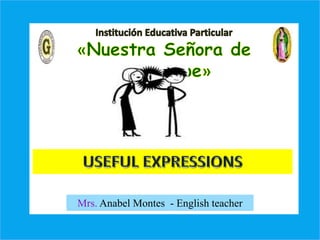 This document contains a list of useful expressions for an English second year class along with examples of how to use them. The expressions are presented in Spanish and include common classroom instructions like "raise your hand," "listen carefully," "open your book," and "may I go to the bathroom." There are also exercises for students to practice filling in blanks with the appropriate expressions.
