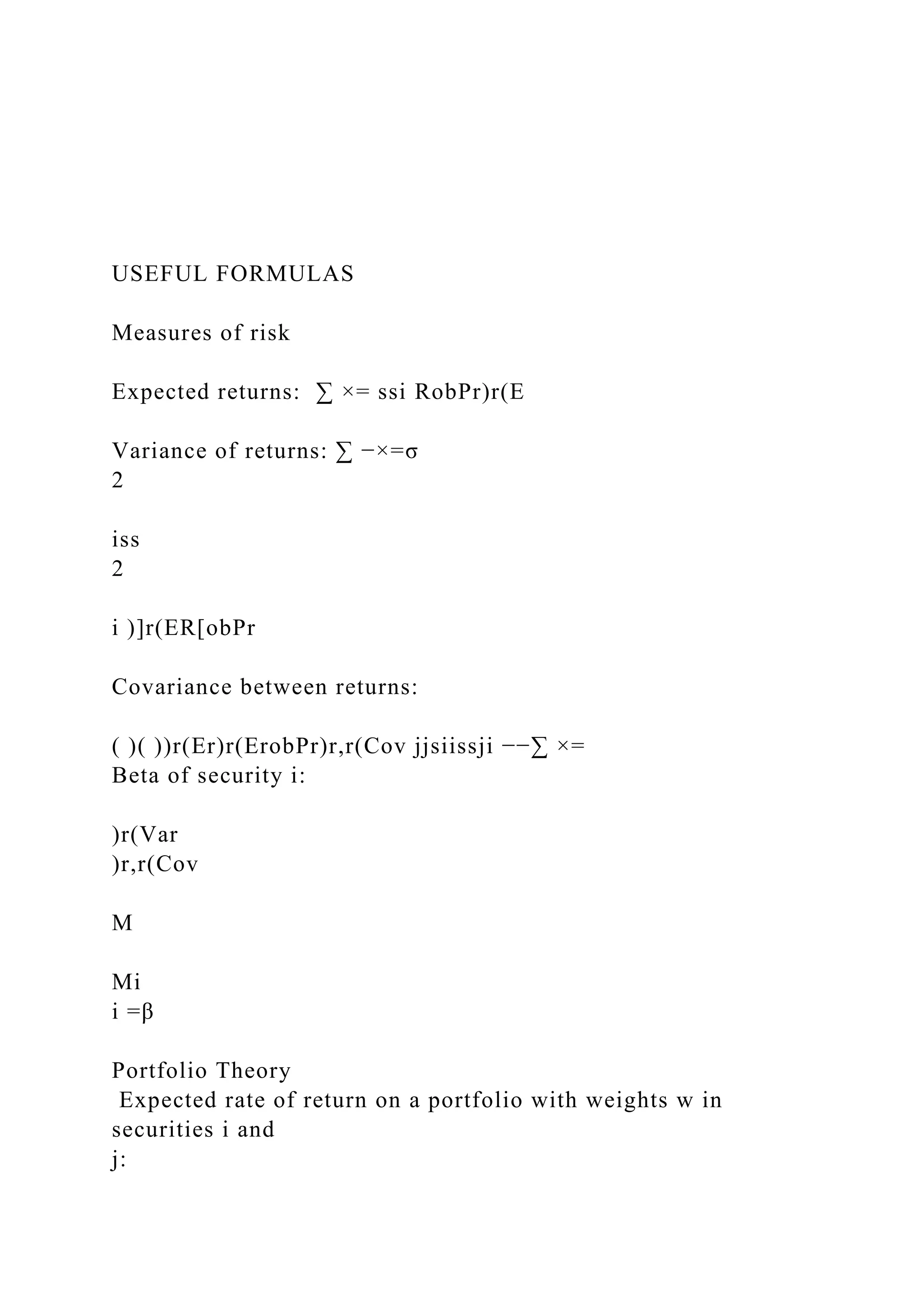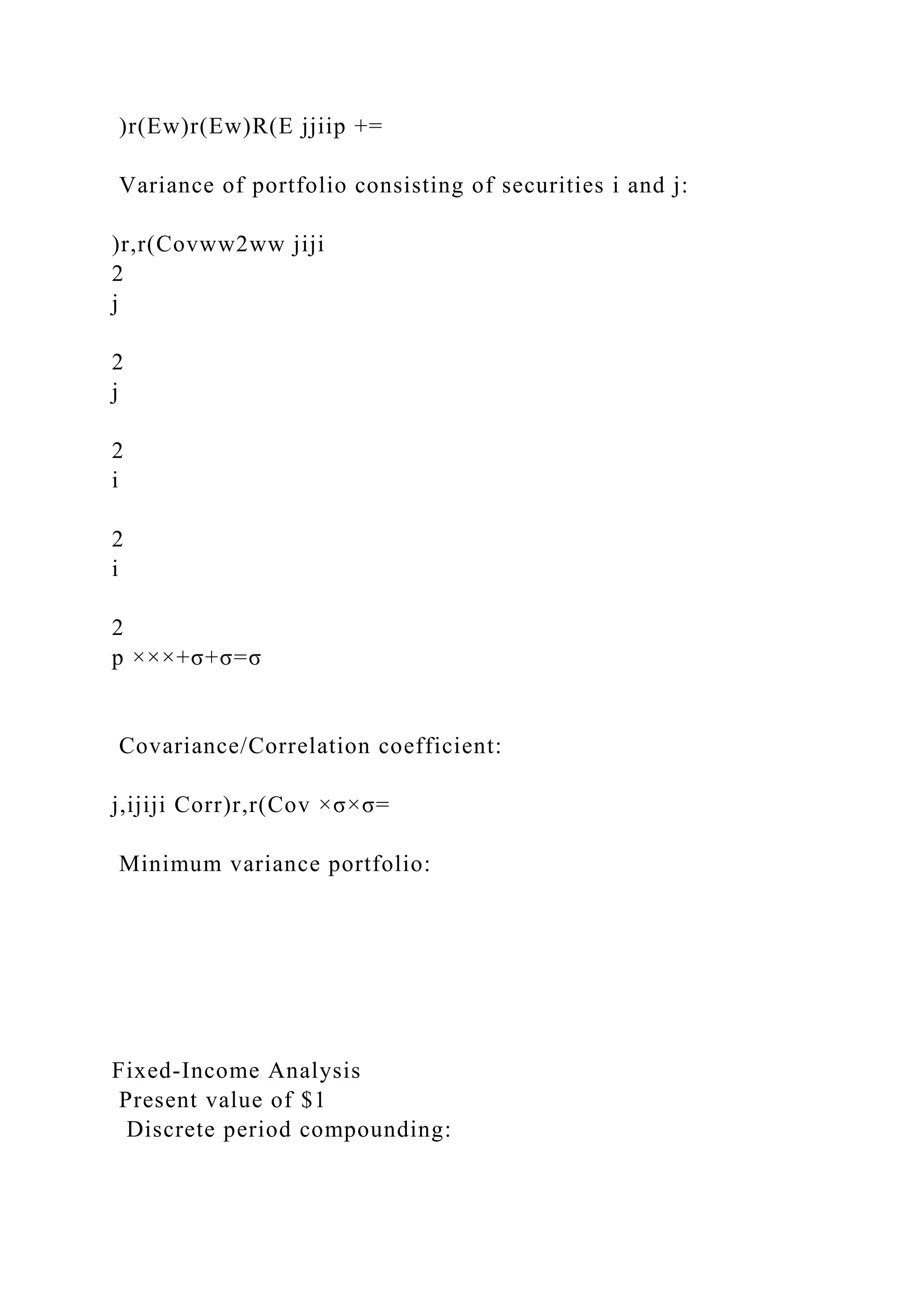 The document provides various formulas related to finance, covering topics including measures of risk, portfolio theory, and fixed-income analysis. It details calculations for expected returns, variances, betas, present values, and performance evaluation metrics such as Sharpe's and Treynor's measures. Additionally, it includes tables for present value interest factors for $1 across different interest rates and periods.