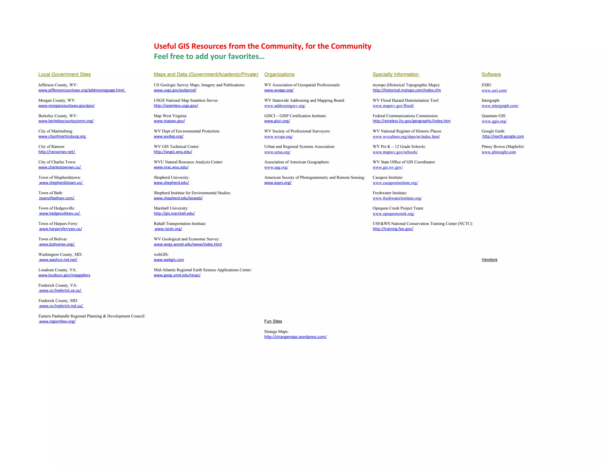 This document provides a list of useful GIS resources from various categories including local government sites, maps and data sources, organizations, specialty information, software, and fun sites. Resources are included from federal, state, local, academic and private entities. The broad range of resources covered in the short list are meant to be helpful for GIS professionals and users in the community.