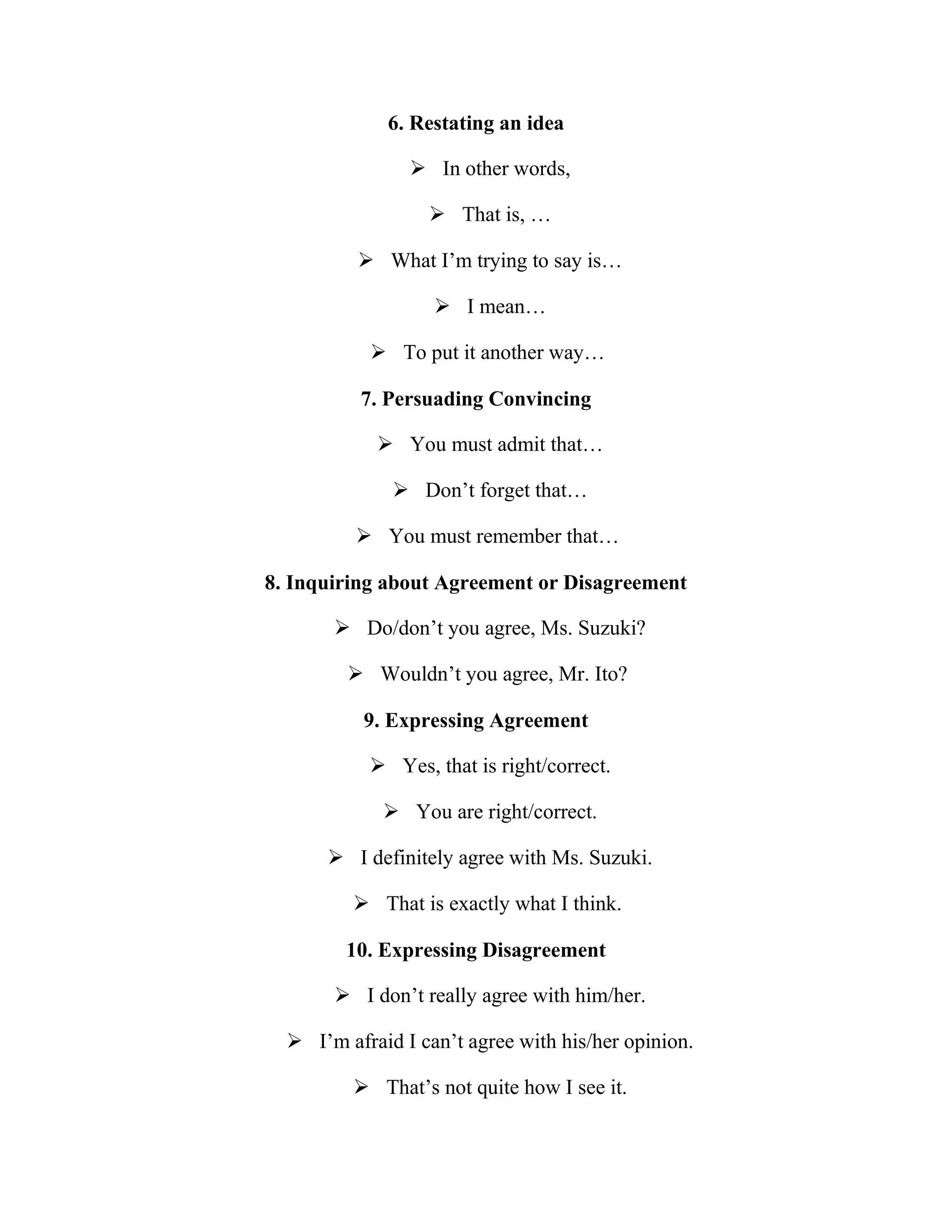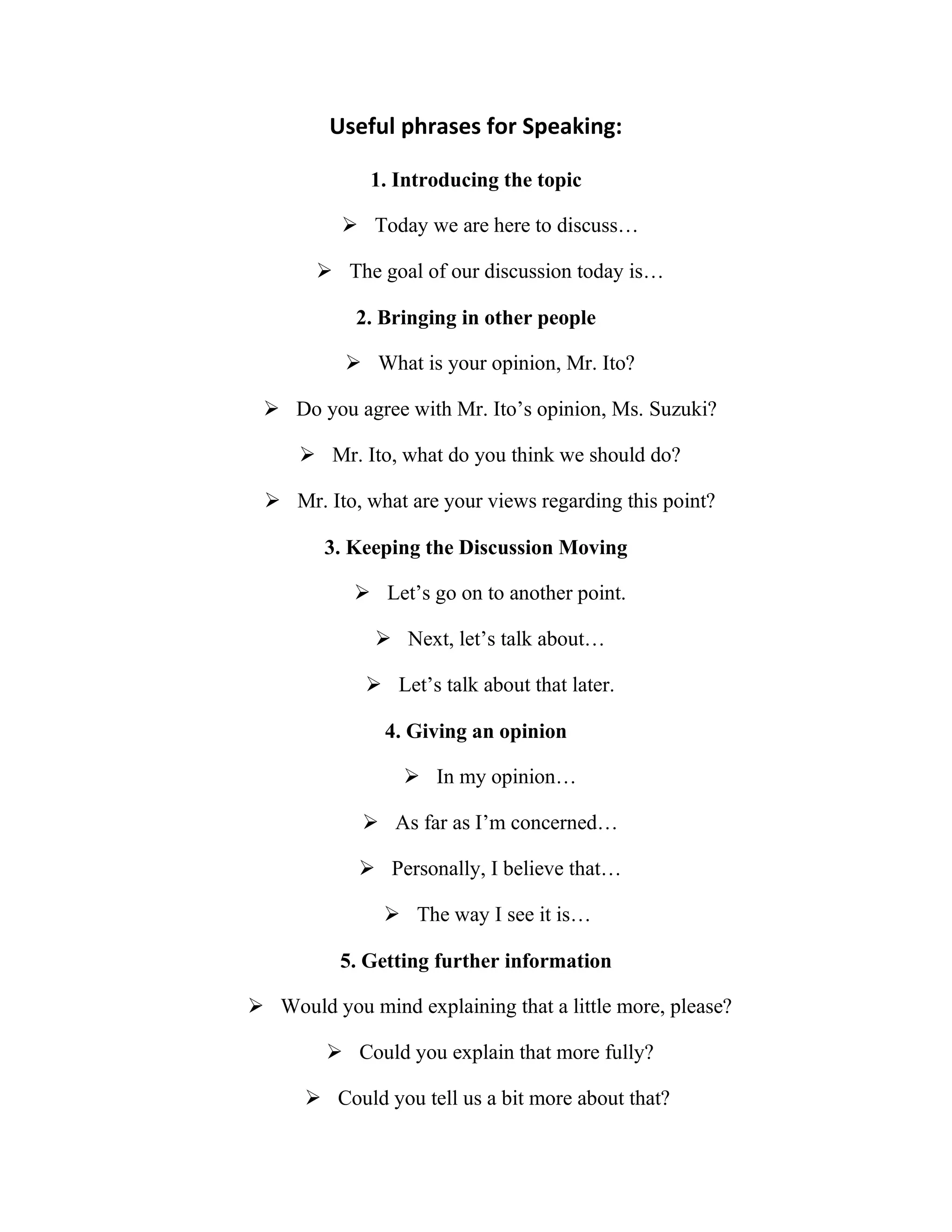 This document provides 26 useful phrases for speaking in various situations during discussions. These include phrases for introducing topics, bringing others into the discussion, moving the discussion forward, giving and explaining opinions, inquiring about agreement, making suggestions, seeking clarification, paraphrasing others' ideas, making comparisons, and closing discussions.