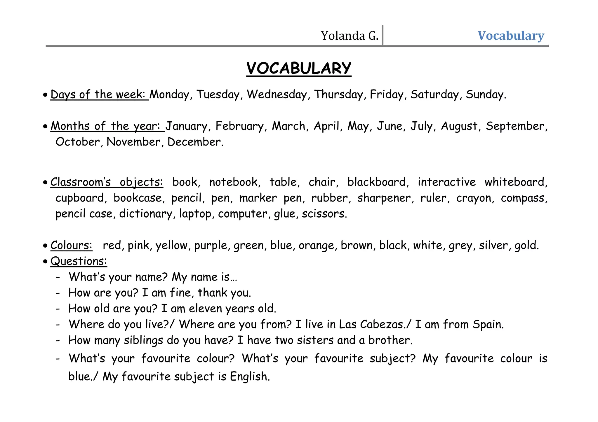 This document provides vocabulary for days of the week, months of the year, classroom objects, colors, questions, and numbers 1-100 in English. It lists the days, months, common classroom items, colors, sample questions to ask someone, and spells out the numbers from one to one hundred.