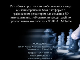 Документ описывает разработку SaaS платформы с графическим редактором для создания 3D интерактивных мобильных путеводителей. Основные функции платформы включают навигацию и информацию, а также упрощённый пользовательский интерфейс, подходящий для пользователей без опыта работы с графикой. Система поддерживает все мобильные и стационарные устройства, предлагая минимальные требования к технической поддержке и возможность удалённого обновления контента.