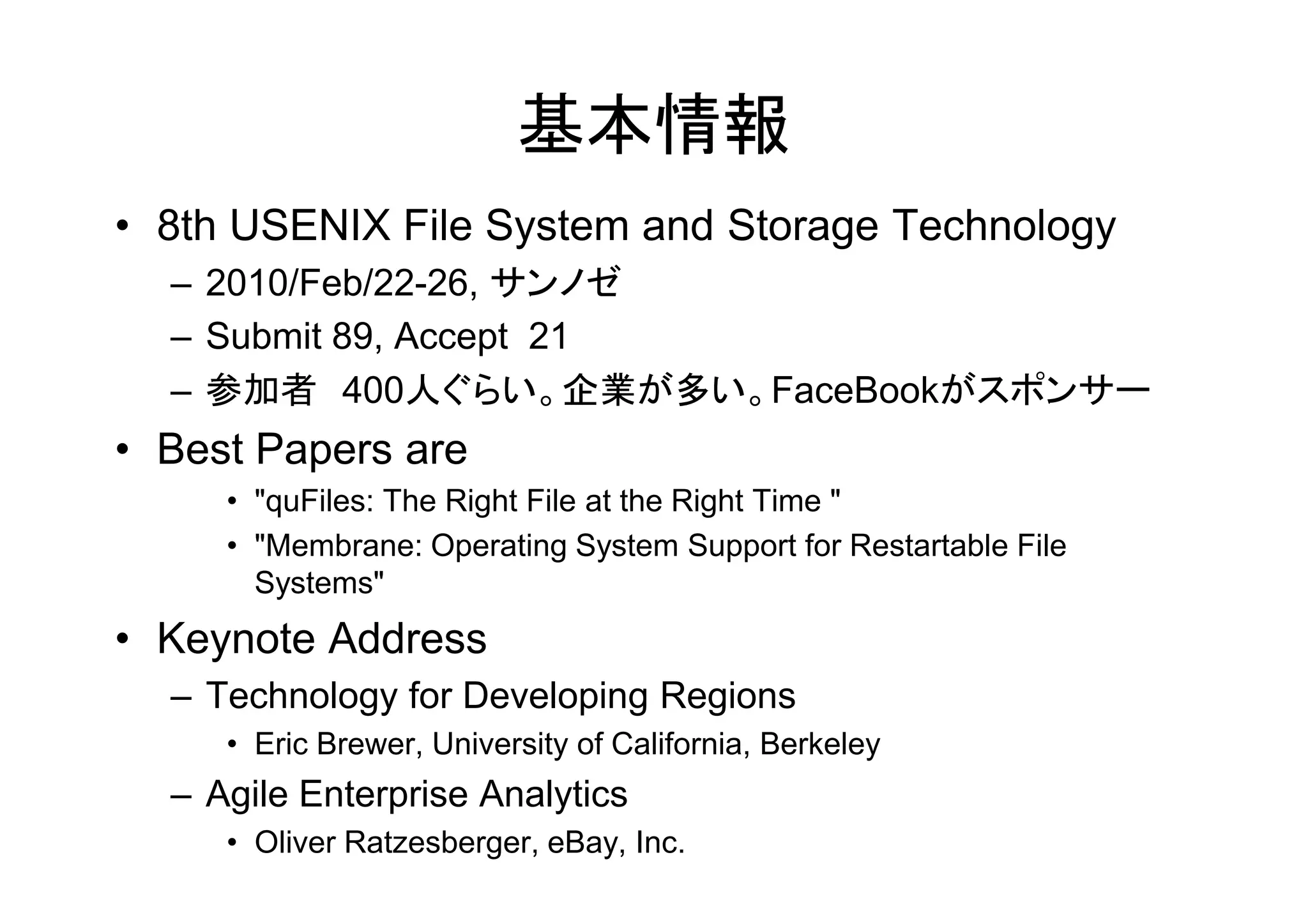 3. Other topics included deduplication, latent sector errors, provenance tracking in file systems, and a "Backlog" technique for adding versioning capabilities to existing file systems.