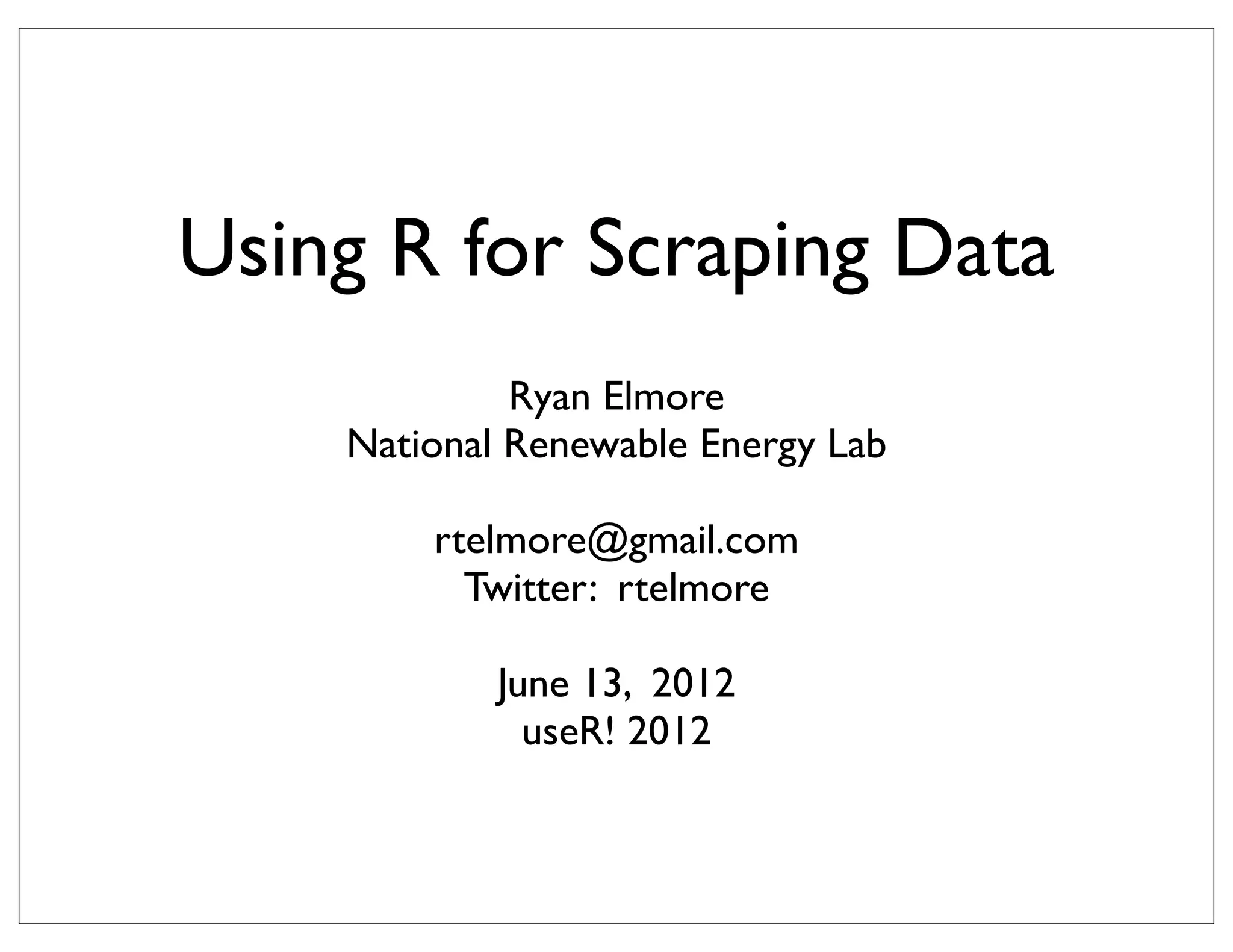 This document discusses using R to scrape baseball box score data from the website baseball-reference.com. It describes breaking down the scraping process into steps: iterating through each MLB team from 2005-2010, each date from April to October, and accessing the box score URLs and tables. The document outlines the R code used to systematically scrape over 78,000 URLs and extract the data tables. It concludes that R provides a powerful platform for web scraping and accessing large amounts of publicly available data.
