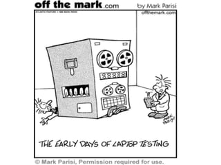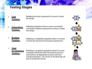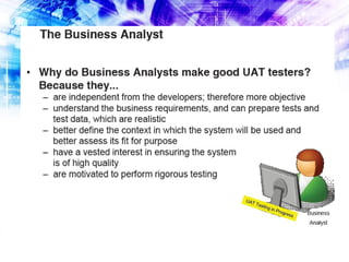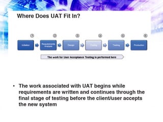 User Acceptance Testing (UAT) involves real business users testing a system to determine if it will provide benefit and be acceptable for use in the organization. During UAT, users test the system according to test cases and document any defects found. The goal of UAT is not to prove a system works, but rather to expose faults before it goes live, as the only way to prove a system is by finding ways for it to fail testing. UAT deliverables include test cases, test results, and a defect log.