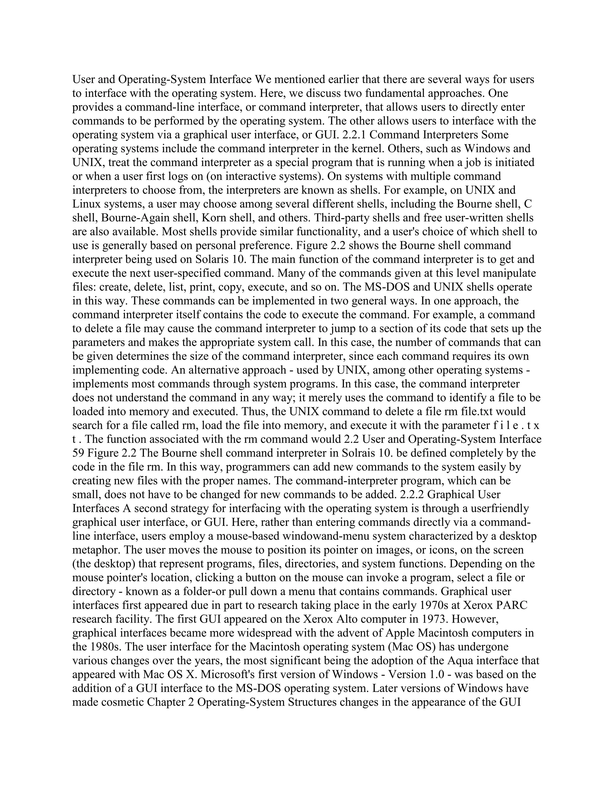 The document discusses two primary user interfaces for operating systems: command-line interfaces (CLIs) and graphical user interfaces (GUIs). CLIs allow users to input commands directly, while GUIs enable interaction through visual elements like icons and menus. It also explains the system calls used for facilitating operations between user programs and the operating system, emphasizing the differences in accessing these interfaces and their impact on user experience.