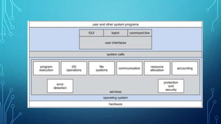 The document outlines user and system programs, describing user programs as applications like web browsers and gaming software that serve end users. It categorizes user interfaces into command-line, batch, and graphics user interfaces, and details system programs as support systems that facilitate program development and execution, including file management and communication services. Overall, it highlights the roles and functionalities of different types of programs in a computing environment.