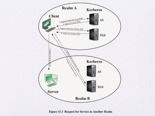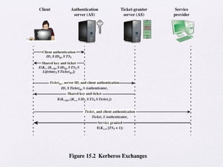 Chapter 15 of 'Cryptography and Network Security' by William Stallings covers user authentication methods, emphasizing the importance of verifying identities via cryptographic keys, passwords, and biometrics. It discusses techniques for mutual and one-way authentication, alongside approaches to combat replay attacks, including timestamps and challenge/response mechanisms. Additionally, it details the Kerberos authentication system and personal identity verification (PIV) standards, showcasing the evolution of authentication practices and technologies.