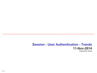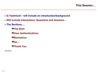 The document presents a session on user authentication trends, focusing on the significance of authentication methods including biometrics. It discusses the importance of understanding user behaviors regarding password security and highlights various biometric technologies and their historical development. The session concludes by emphasizing the critical need for secure authentication mechanisms to prevent unauthorized access.
