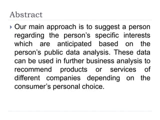 The document discusses a framework for a recommendation system based on user behavior modeling derived from social networks, particularly emphasizing personality traits using the 'big five' model. It highlights data collection and analysis methods, including sentiment analysis of social media content to categorize users' behaviors. The application of this system aims to assist businesses and organizations in making informed decisions based on consumer interests and tendencies.