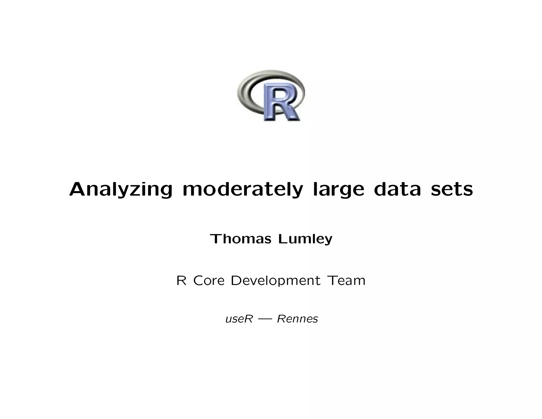 This document discusses strategies for analyzing moderately large data sets in R when the total number of observations (N) times the total number of variables (P) is too large to fit into memory all at once. It presents several approaches including loading data incrementally from files or databases, using randomized algorithms, and outsourcing computations to SQL. Specific examples discussed include linear regression on large data sets and whole genome association studies.