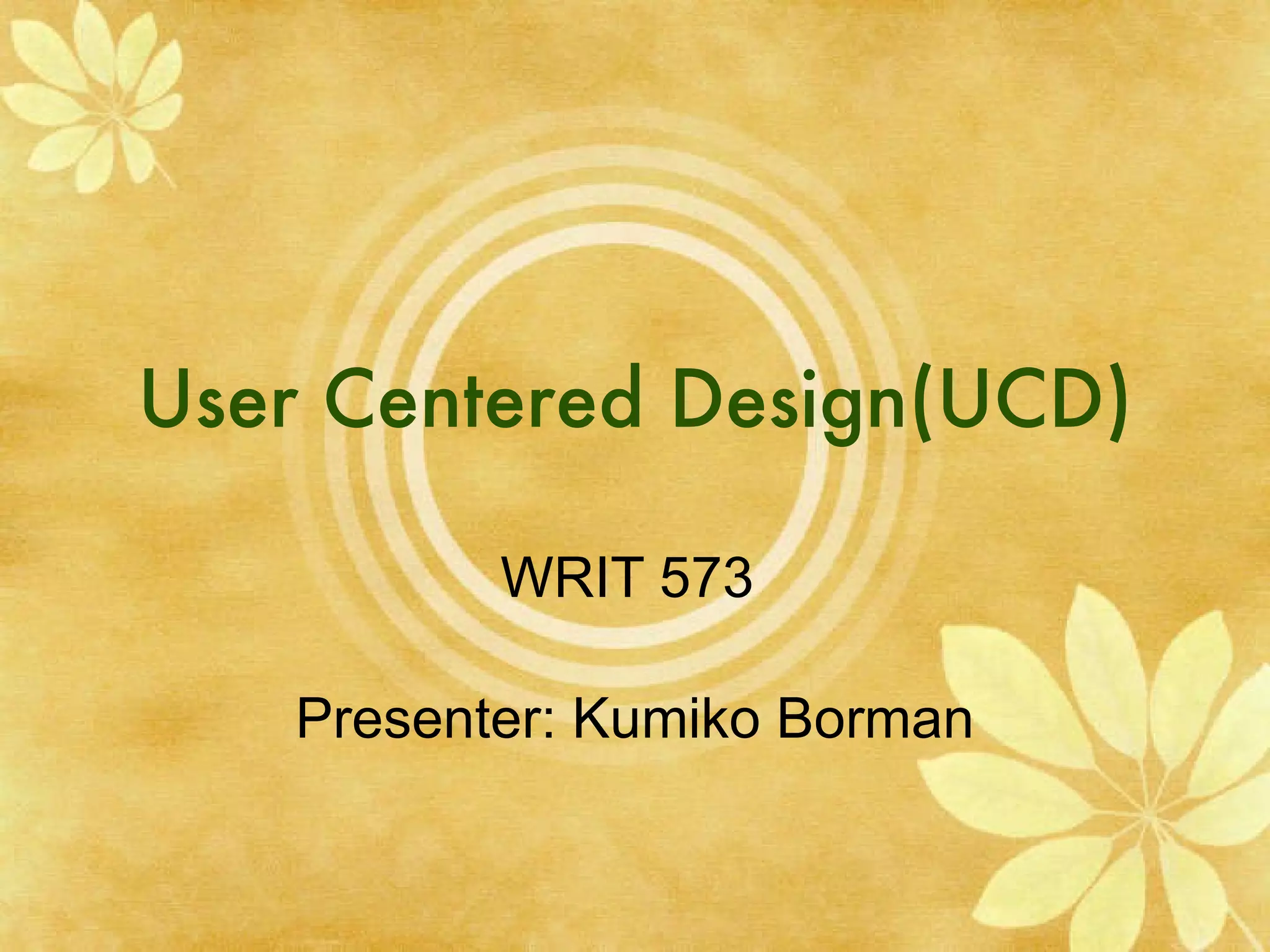 User Centered Design (UCD) is a design philosophy that places users at the center of the product development process. The UCD process involves understanding who the users are, what tasks they need to accomplish, and their experience levels. It also focuses on understanding what functions and information users need and how they think the product should work. Elements of UCD include usability, accessibility, and involving users from the beginning through repeated testing. The goal of UCD is to cut costs and increase user satisfaction and productivity.