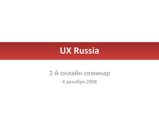 Документ описывает второй онлайн-семинар по юзабилити, состоявшийся 4 декабря 2008 года, с акцентом на важность ориентированного на пользователя дизайна и его методологических основ. В нем представлена программа семинаров на декабрь, описание персонажей и их значимость в процессе проектирования, а также обсуждение методов сбора информации для понимания потребностей пользователей. Также рассматриваются прототипирование и юзабилити-тестирование как ключевые этапы разработки продуктов, с примерами и рекомендациями.