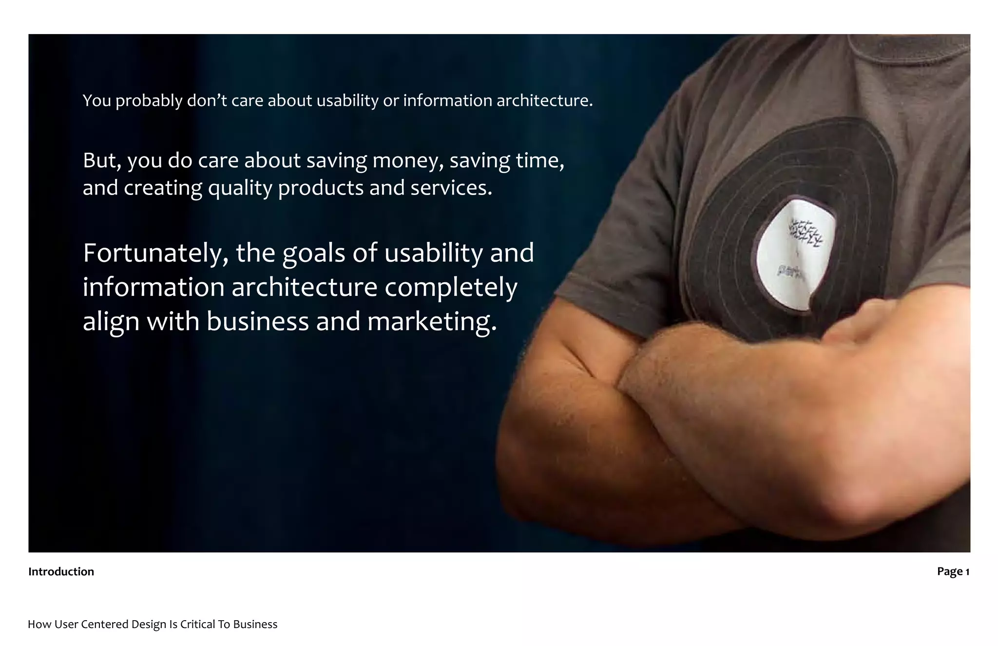 The document discusses how usability and information architecture align with business goals of saving money, saving time, and creating quality products and services. It notes that focusing on users is critical to reducing costs and failures, as well as increasing usage, adoption, quality, and competitive advantage. User centered design can help accomplish many business objectives.