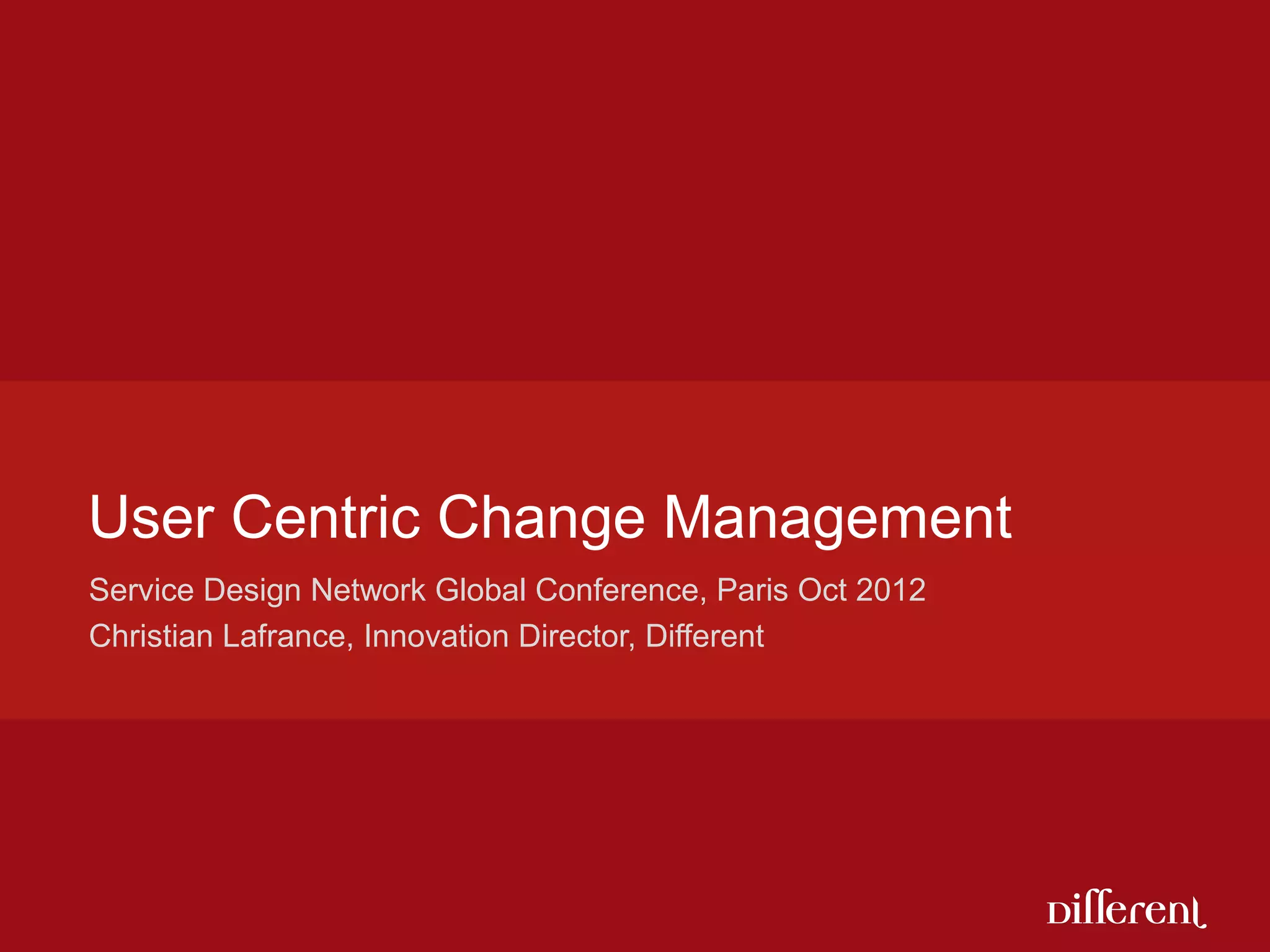 The document discusses user-centric change management methods presented at a global conference in Paris in October 2012 by Christian Lafrance. It emphasizes co-designing services and embedding changes through staff participation, early prototyping, and effective communication strategies. Key outcomes include validating new service designs and addressing staff buy-in to facilitate successful change implementation.