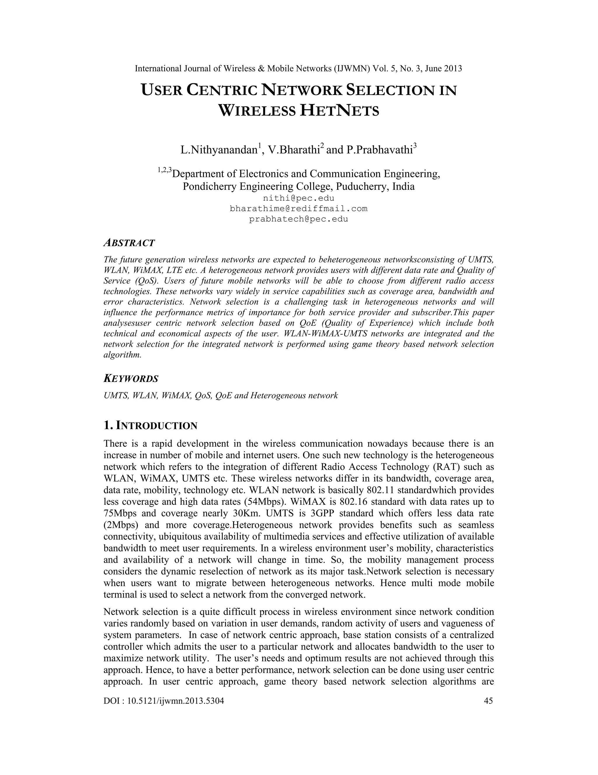 This document discusses user-centric network selection in heterogeneous wireless networks. It proposes using game theory based algorithms to allow users to select the optimal network based on their individual needs and preferences. Specifically, it analyzes Bush-Mosteller and Boltzmann-Gibbs reinforcement learning algorithms for network selection among integrated UMTS, WLAN and WiMAX networks. Simulation results show the impact on metrics like throughput, delay and load for each network under different user conditions and applications.