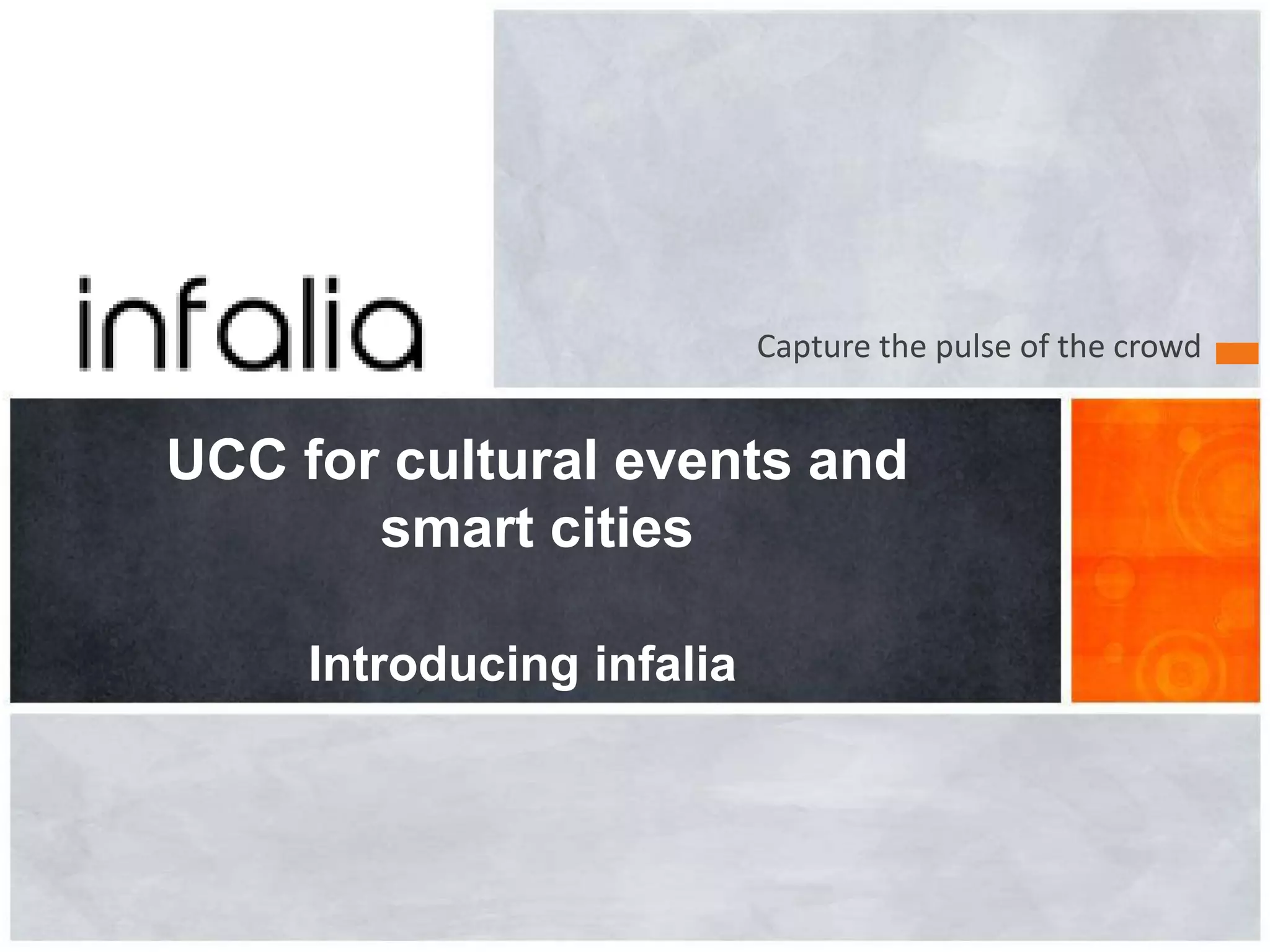 Infalia introduces a platform that collects user generated content from cultural events and smart cities to gain insights. The platform digitizes real-world processes, engages users through mobile apps, collects their input, analyzes the data, and provides tools to optimize experiences. Their EventSuite apps and analytics improve events using attendees as living sensors, while their Smart Cities platform enables citizen-government communication. Their goal is to become core technology providers in social media mining, multimedia analysis, and big data through growing a large committed user base.
