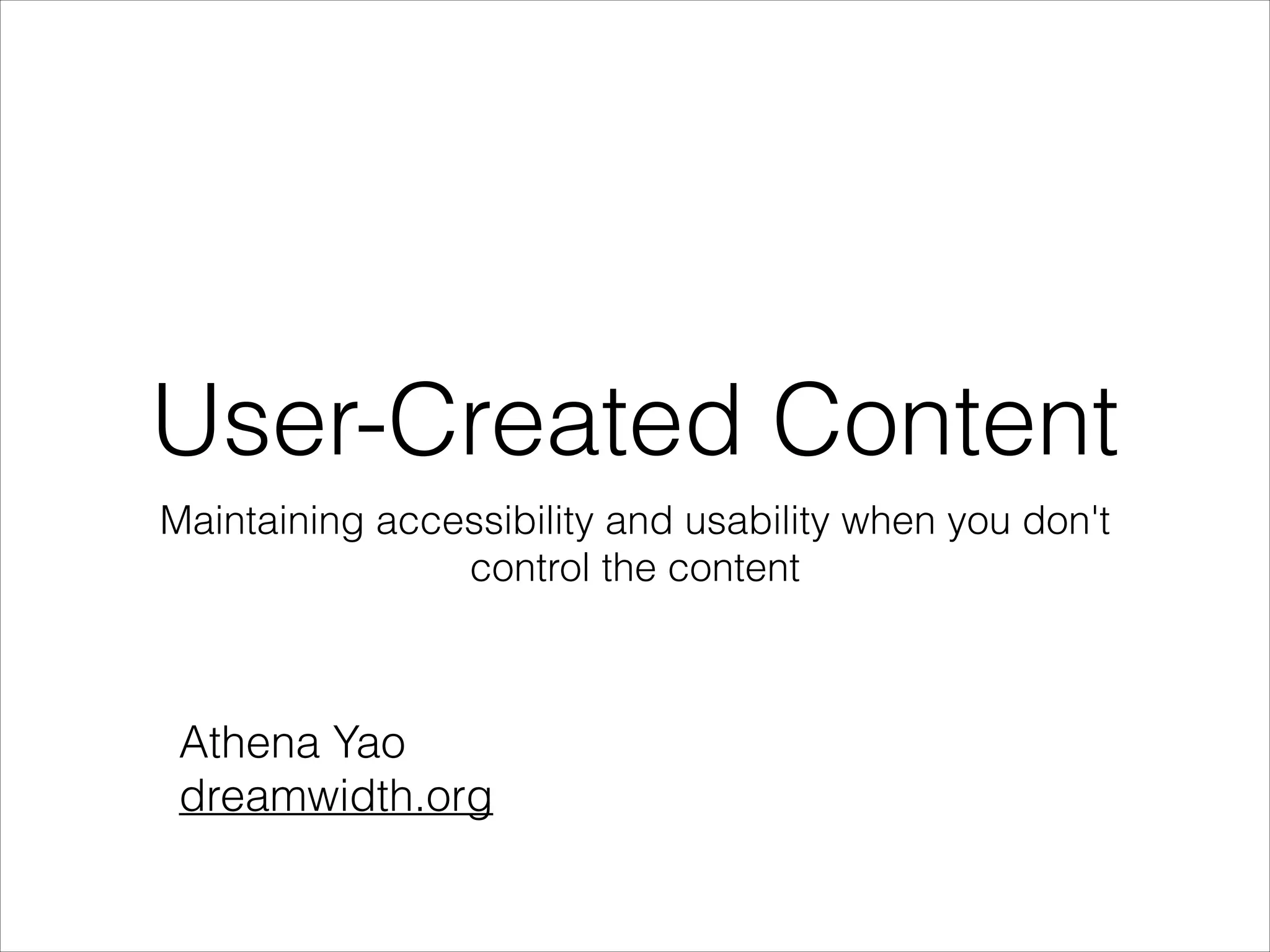 The document discusses the importance of maintaining accessibility and usability in user-created content, focusing on authoring tools rather than solely on written content. It highlights key principles from the W3C Web Accessibility Initiative Authoring Tool Accessibility Guidelines (ATAG) and outlines common pitfalls in providing alternative text for images. The document also emphasizes the need to understand user capabilities and preferences regarding accessibility features.