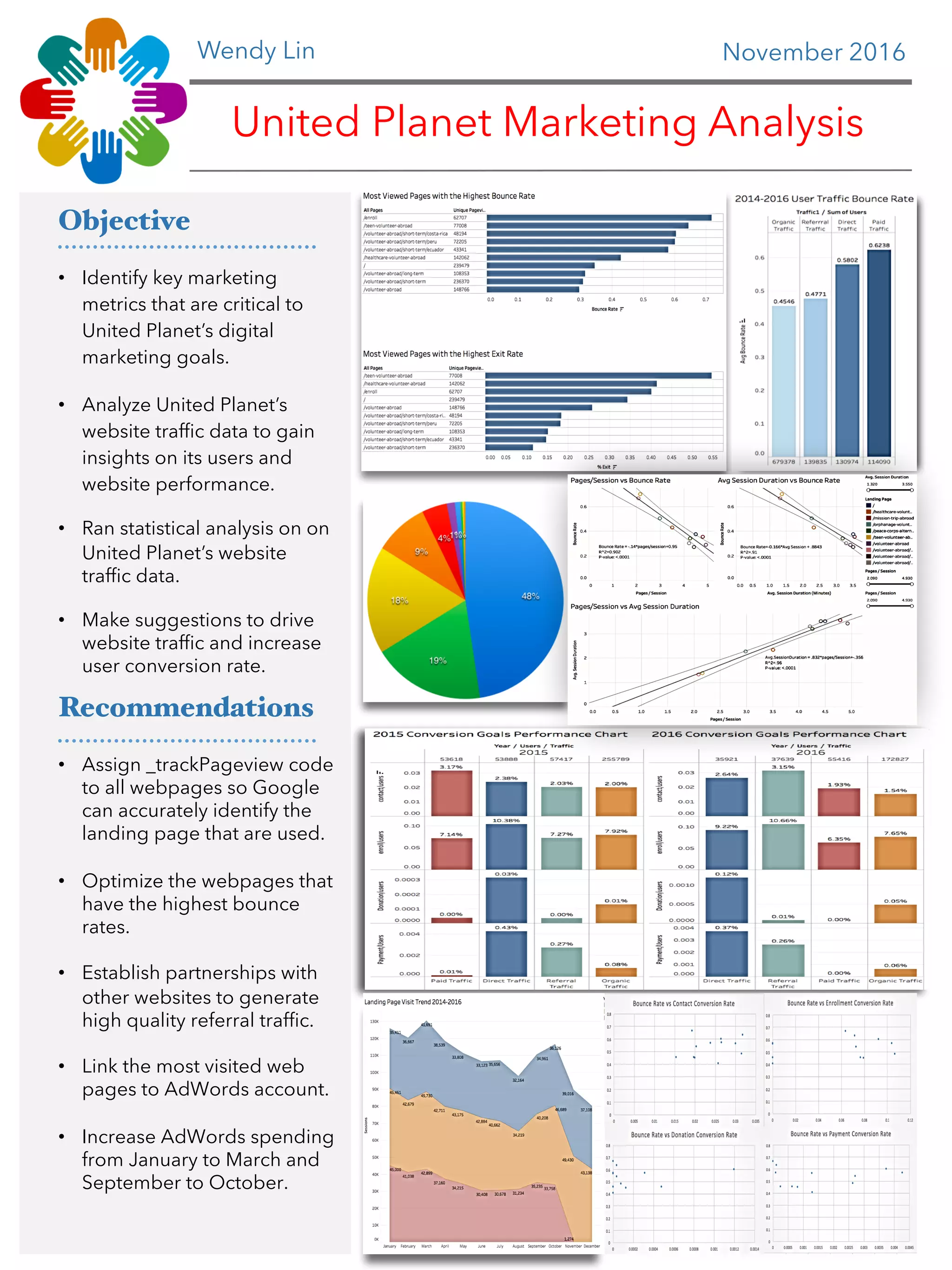 United Planet Marketing Analysis examines key metrics like website traffic and user behavior to understand performance and provide recommendations. It identifies objectives like analyzing traffic data to gain insights and make suggestions to drive more traffic and conversions. Recommendations include accurately tracking landing pages, optimizing high bounce pages, generating referral traffic through partnerships, linking popular pages in AdWords, and increasing AdWords spending seasonally.
