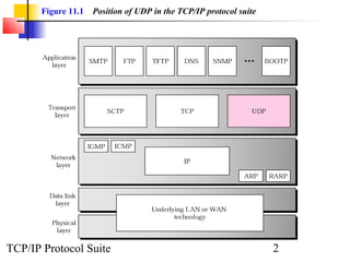 This document discusses the User Datagram Protocol (UDP) which provides a connectionless mode of communication between applications on hosts in an IP network. It describes the format of UDP packets, how UDP checksums are calculated, and UDP's operation including encapsulation, queuing, and demultiplexing. Examples are provided to illustrate how a UDP control block table and queues are used to handle incoming and outgoing UDP packets. The document also discusses when UDP is an appropriate protocol to use compared to TCP.