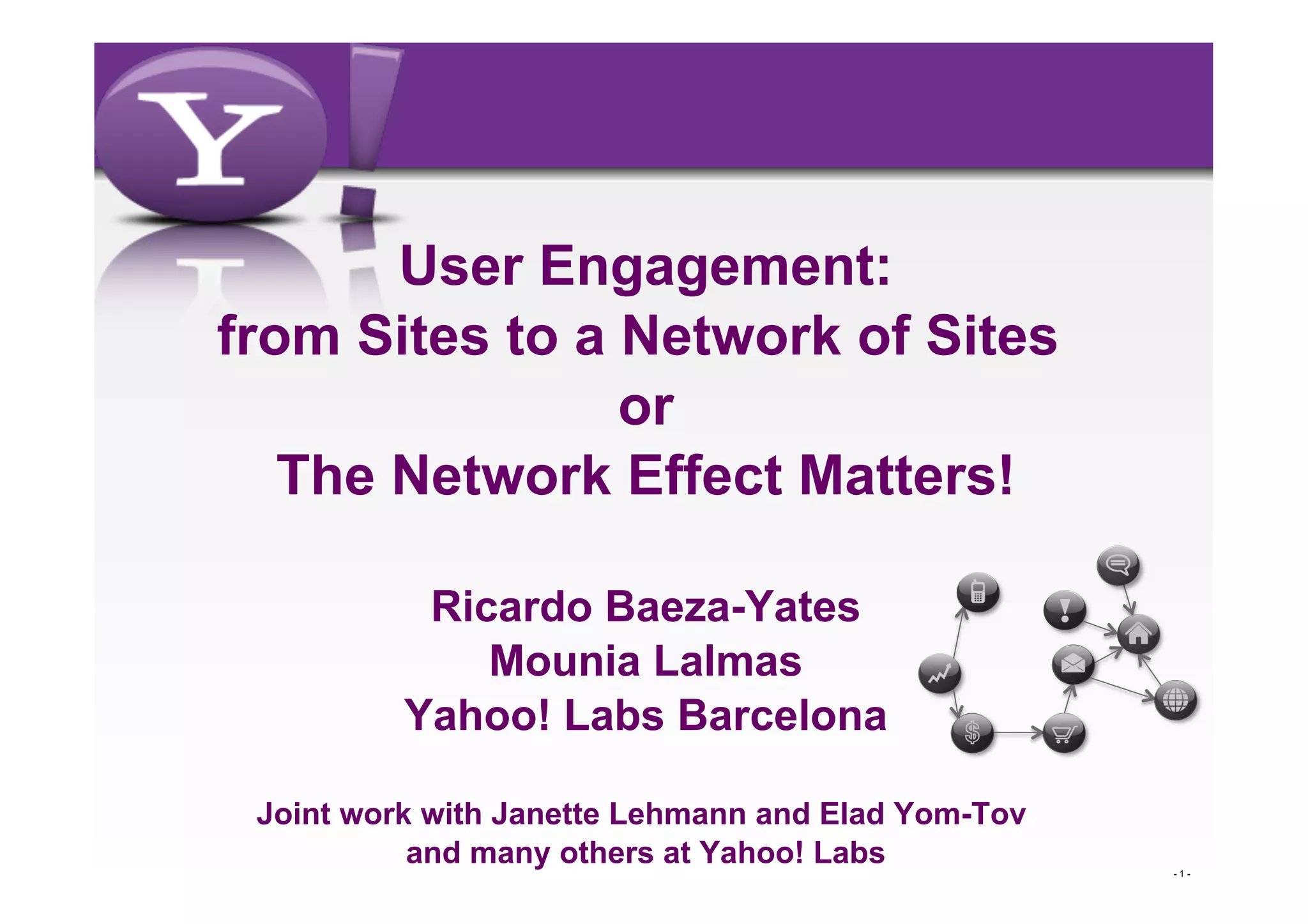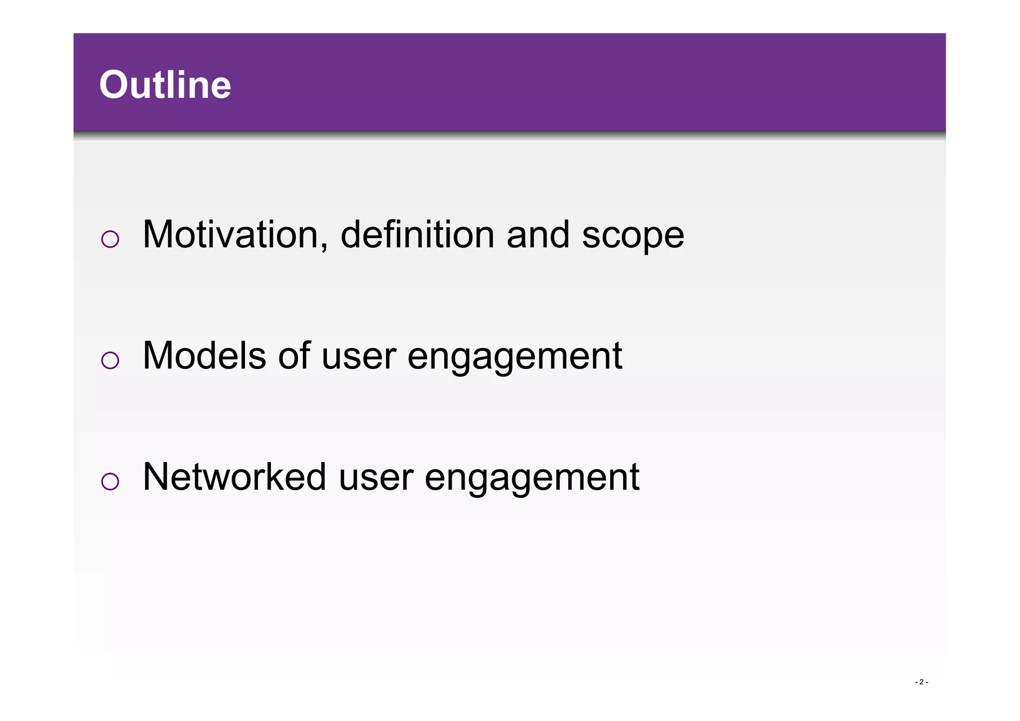 This document discusses user engagement across websites and networks of websites. It defines user engagement as the emotional, cognitive, and behavioral connection between a user and a technological resource. The document outlines different models of user engagement, including factors that characterize engagement and how it can be measured. It also describes analyzing a network of websites to better understand how user engagement differs depending on the type of site, users, and time period. The goal is to develop models that capture these diversity and allow comparisons of engagement levels across different classes of websites.
