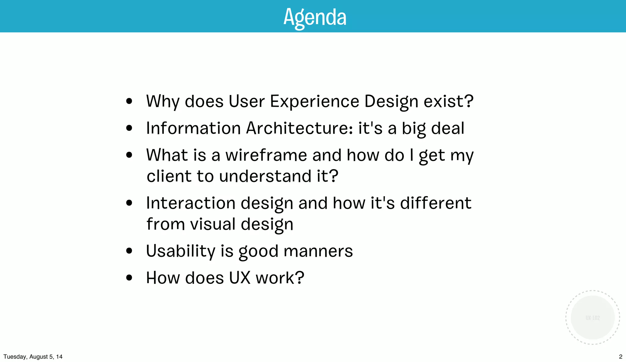 The document is a transcript from a UX 102 class that discusses various topics related to user experience design such as why UX design exists, information architecture, wireframes, interaction design versus visual design, usability, and how the UX design process works. Specific topics covered include defining information architecture and different information architecture patterns, explaining what wireframes are and how they differ from visual design, discussing how interaction design focuses on user goals and behaviors while visual design focuses on aesthetics, and outlining the typical UX design process from research to prototyping to testing.