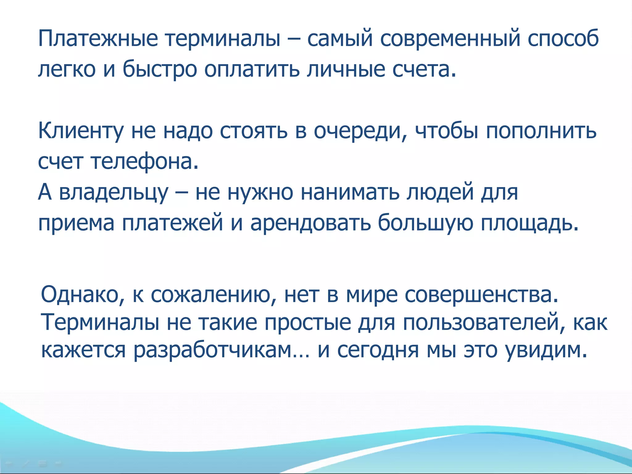 Документ обсуждает проблемы удобства использования платежных терминалов, предлагая рекомендации по улучшению интерфейсов. Основные акценты сделаны на необходимости хорошей читаемости, простоты и логичности интерфейса для пользователей. Также подчеркивается важность тестирования интерфейсов на реальных пользователях для выявления недостатков.