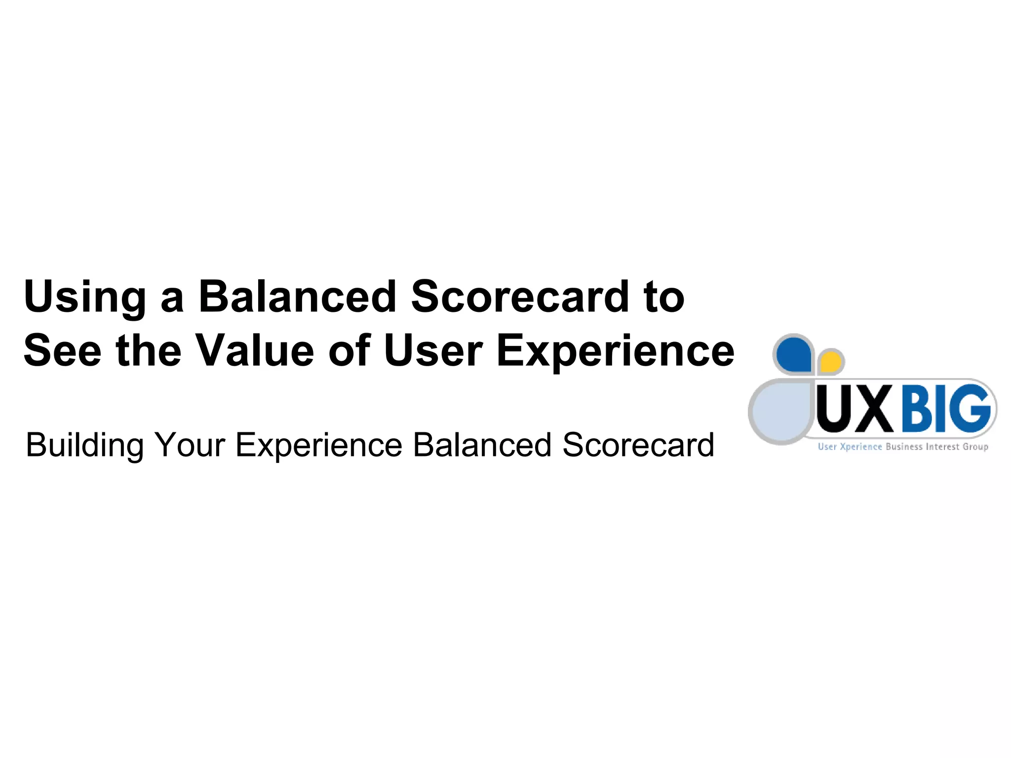 The document discusses using a balanced scorecard approach to measure user experience. It provides an overview of balanced scorecards and their four perspectives: financial, customer, internal processes, and learning and growth. It then shows how user experience strategies and objectives can be mapped to each of the four perspectives in a user experience balanced scorecard. For example, under the financial perspective, objectives could include increasing revenue and reducing costs, while under customer it could focus on increasing conversions, retention, and loyalty. The document provides examples of objectives, measures, targets, and initiatives that could be included in a user experience balanced scorecard.
