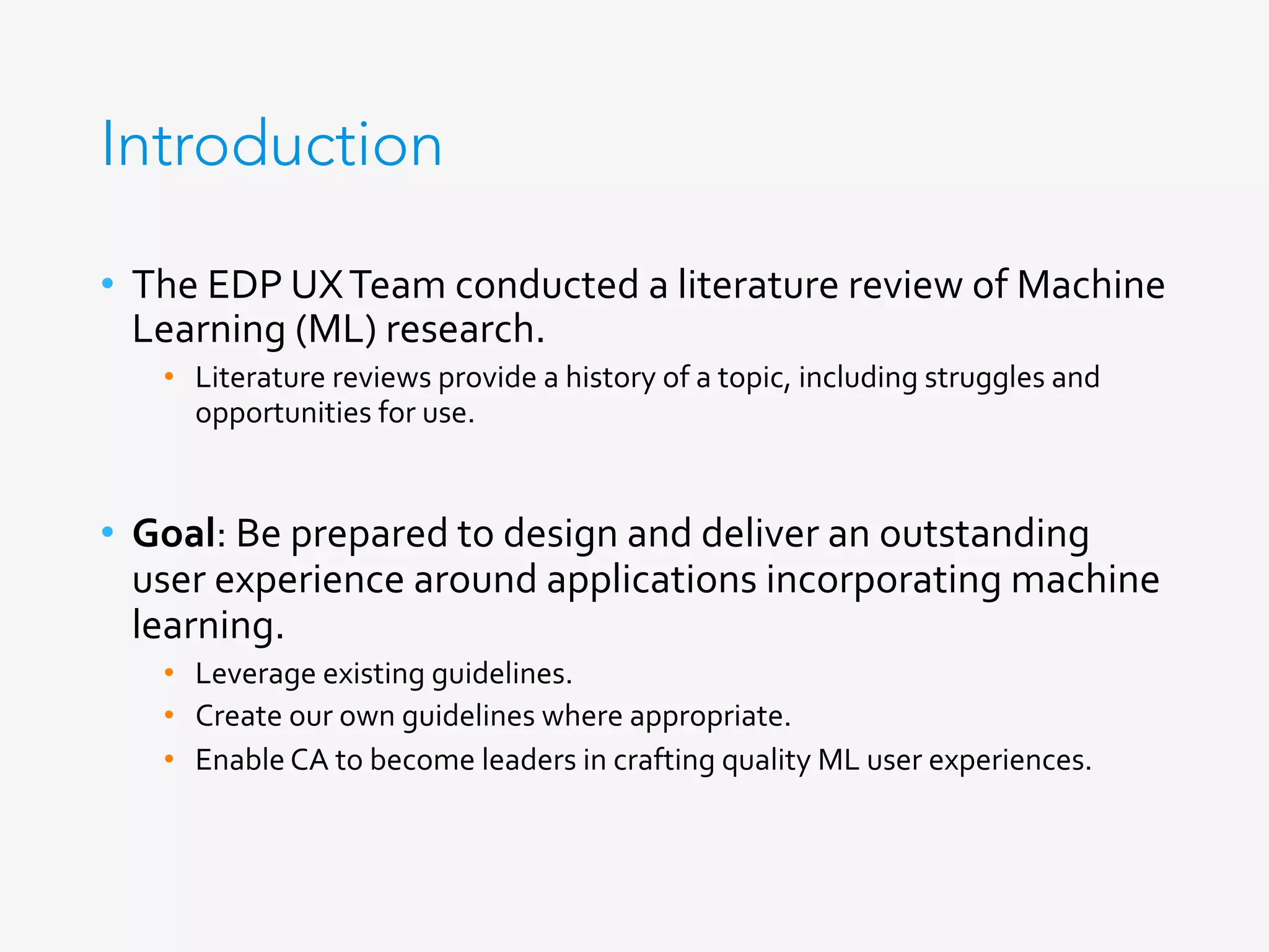 The document discusses user experience considerations for machine learning applications, outlining key insights from a literature review conducted by the EDP UX team. It highlights user issues such as the importance of technology literacy and cognitive biases, as well as design opportunities to improve transparency and trust in ML products. Additionally, the document emphasizes the need for effective communication design to enhance user understanding and acceptance of machine learning technologies.