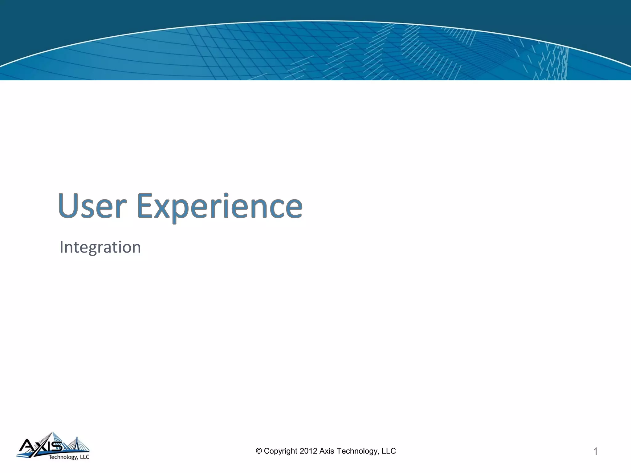 The document discusses user experience (UX) integration, focusing on the balance between user needs, content, and business goals through user-centered design and information architecture. It outlines methodologies including stakeholder interviews and usability testing, and provides examples of projects that enhance the experience for complex customer segments. Key success factors for effective UX are highlighted, emphasizing the alignment of user needs with business objectives and intuitive navigation.