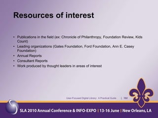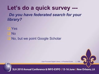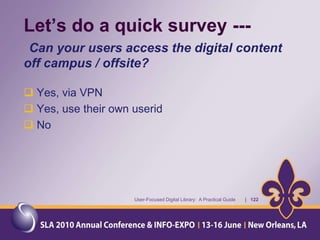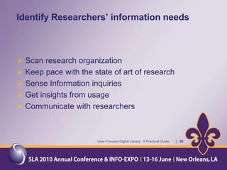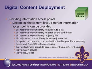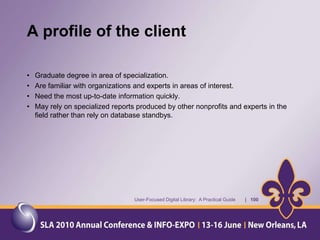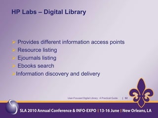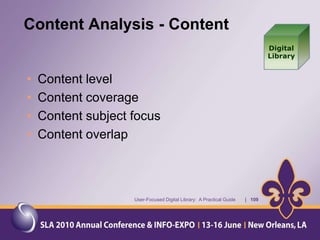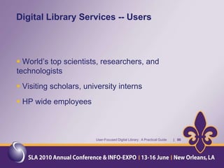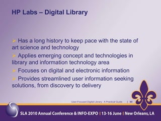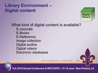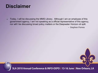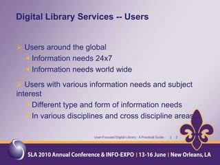 The document provides an overview of a presentation about a user-focused digital library. It discusses understanding users, digital library content, and different types of libraries. It also gives examples of defining a digital library and understanding the environment and settings of different libraries. Finally, it provides a disclaimer and agenda for a discussion on the MMS Library, including an overview of the Minerals Management Service and how the MMS Library serves its customers.