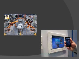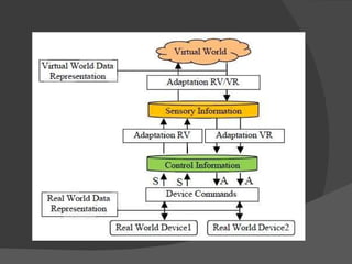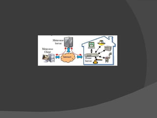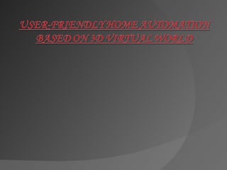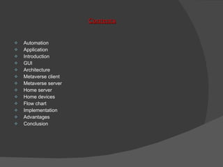 The document discusses using a 3D virtual interface to automate home devices. It proposes an architecture with a metaverse client, metaverse server, home server, and home devices. The home server would connect to devices using Bluetooth, WLAN, and UPnP and control them in a hierarchical structure. The 3D virtual interface provides a realistic and intuitive way for users to control automated home functions.