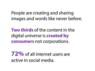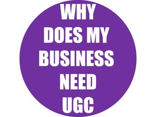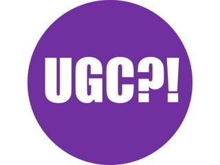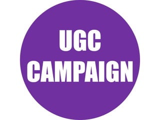 This document discusses user-generated content (UGC) and its benefits for businesses. UGC is defined as content created by online users, including blogs, videos, photos, and more. The document notes that UGC can generate trust from consumers by including recommendations from people they know. It also increases conversion rates and marketing reach for businesses. Specific examples are provided of successful UGC campaigns run by companies like Burberry, Starbucks, Coca-Cola, and others. Challenges of UGC campaigns and how to promote them are also addressed.