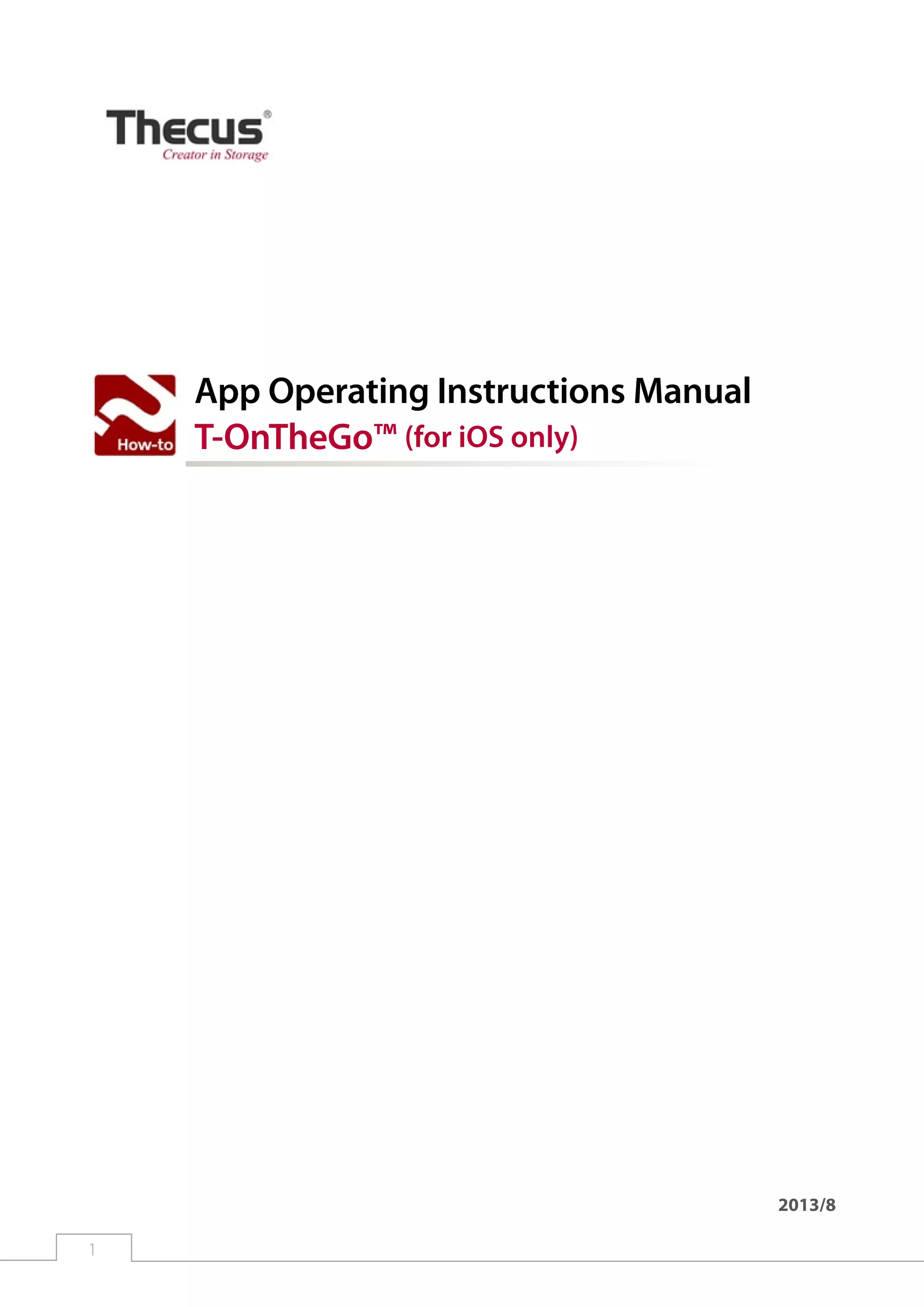 This document provides instructions for using the T-OnTheGo app to manage files on a Thecus NAS drive from an iOS device. It describes how to install the app, connect to a NAS via WebDAV, and perform basic file management tasks like uploading, downloading, playing media, and viewing files. Instructions are given for changing app settings and accessing, moving, copying, and deleting files stored on the networked storage device.