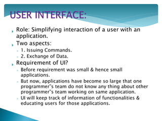 The document discusses user interfaces (UI) and their components. A UI simplifies user interaction with applications by managing commands and data exchange. As applications grew larger, UIs were needed to track functionality and educate users. A UI has two main components: a dialog manager that handles conversations between the user and application, and a presentation manager that displays application data. The document then covers various ways of implementing command dialogs, presenting data, providing online help, and developing UIs using management systems.