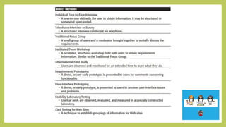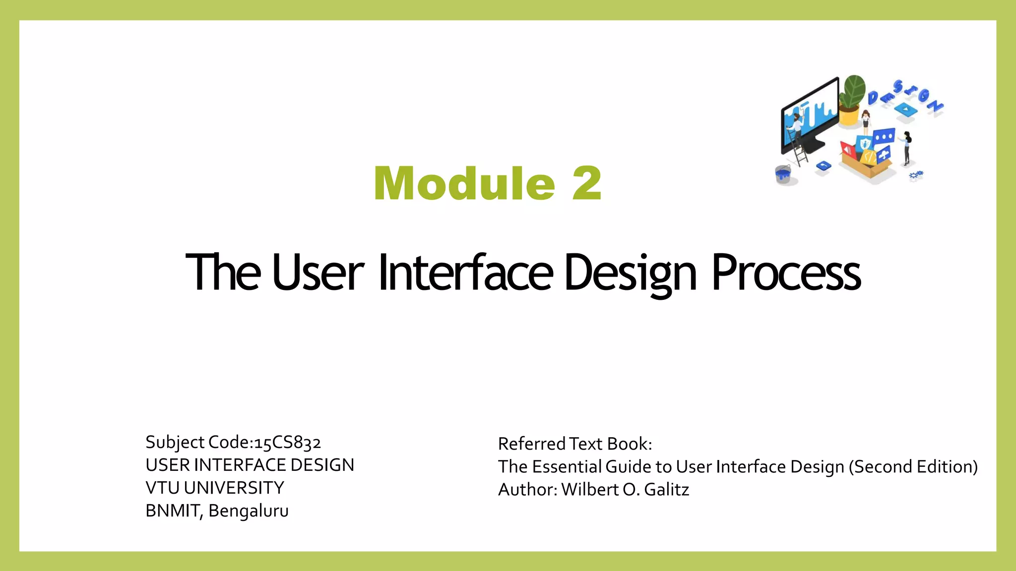 Module 2 outlines the user interface design process, detailing steps such as understanding user needs, developing effective screens, and ensuring usability through testing. It emphasizes the importance of human characteristics in design and highlights common pitfalls in system development. The module also discusses design standards and the necessity of clear documentation and training to enhance user interaction and satisfaction.