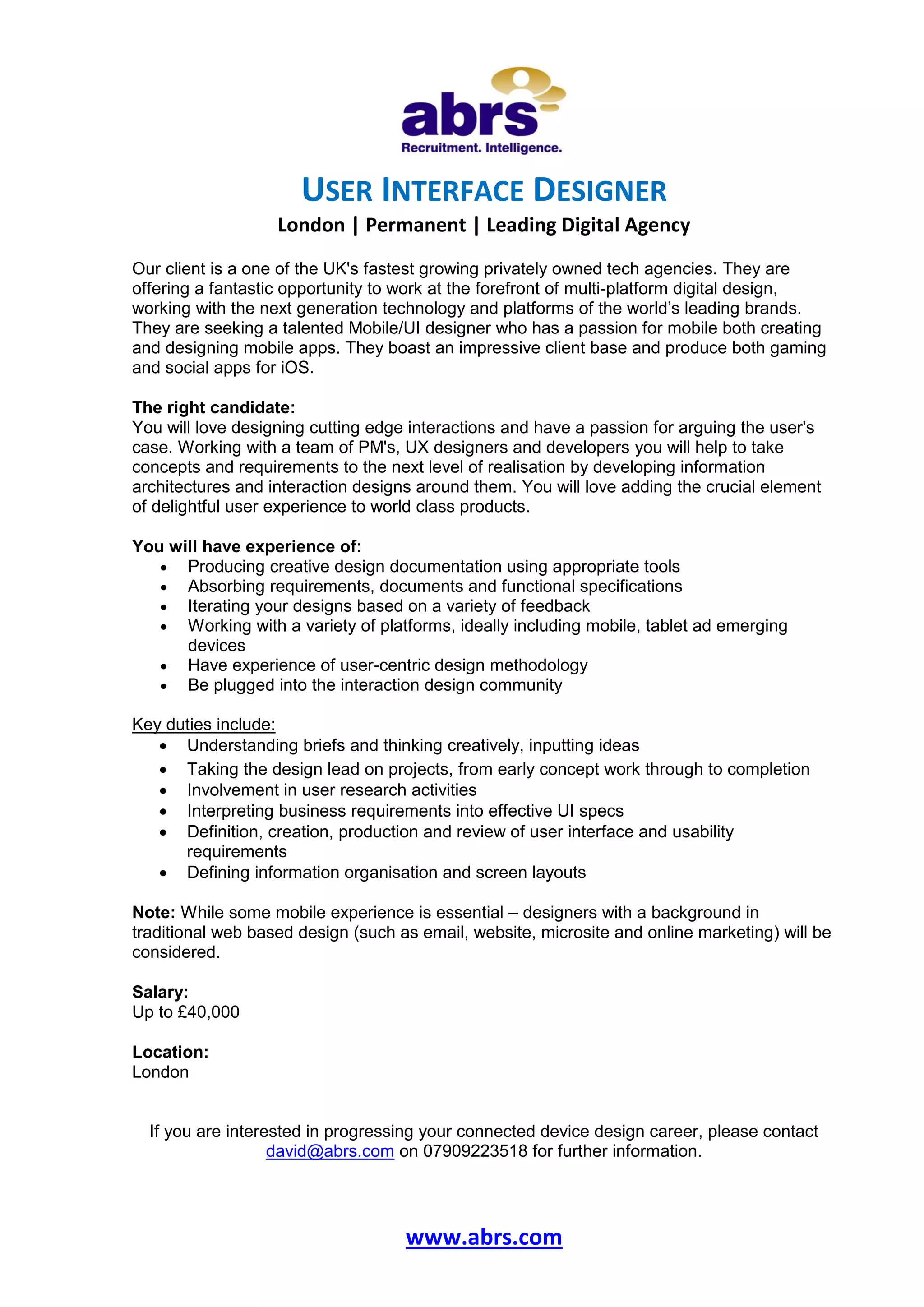 This job posting is for a User Interface Designer position at a leading digital agency in London. The agency is seeking a talented Mobile/UI designer with a passion for designing mobile apps for both gaming and social apps. Responsibilities include understanding briefs, inputting creative ideas, taking the design lead on projects from concept to completion, conducting user research, and defining information organization and screen layouts. The ideal candidate has experience producing design documentation, iterating designs based on feedback, and working with mobile, tablet, and emerging devices. While some mobile experience is required, designers with web design backgrounds will also be considered. The salary is up to £40,000 per year and the location is London.