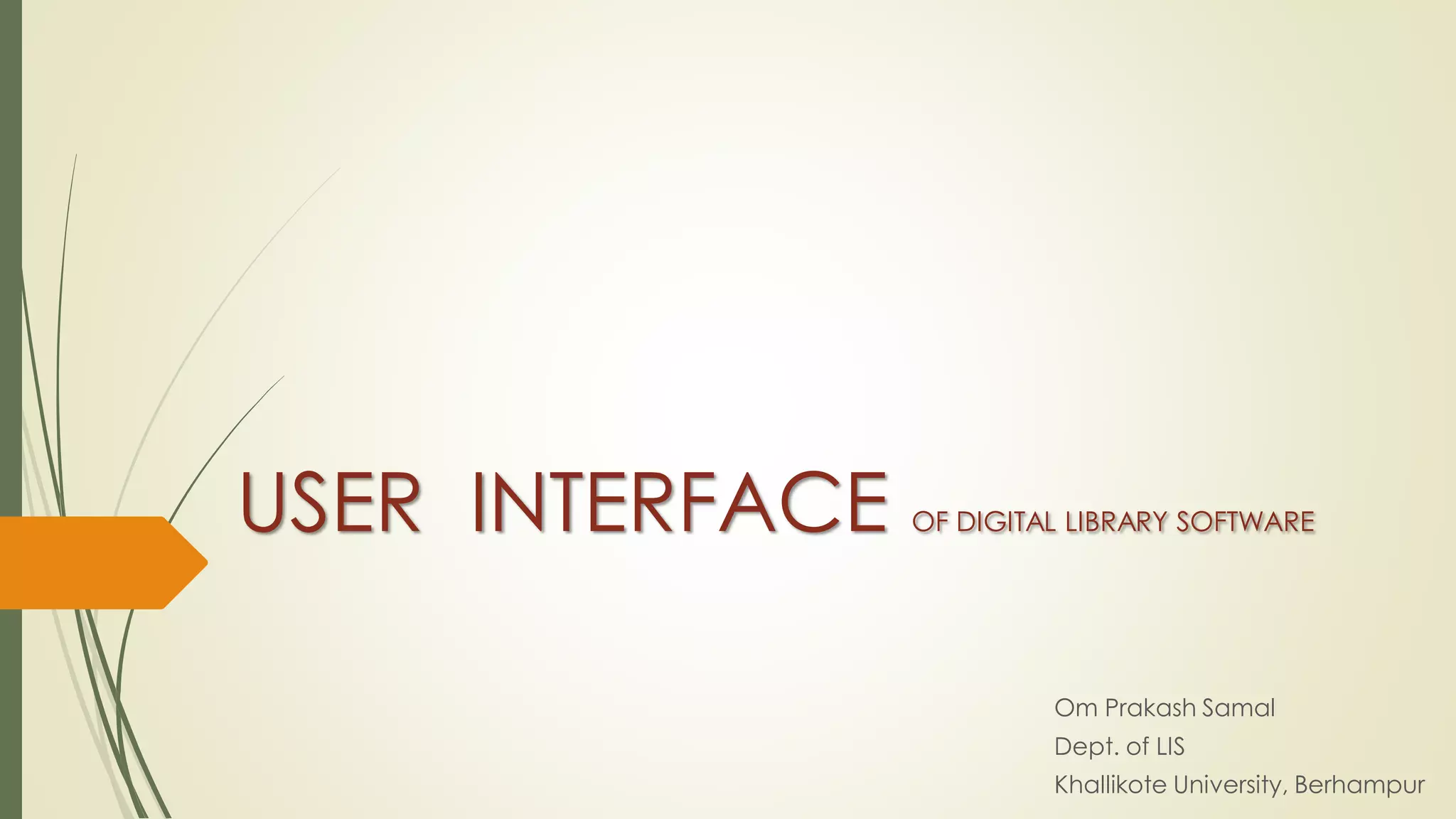 This document discusses the user interface of digital library software. It defines what a user interface is and explains that it is important for digital libraries to have an effective user interface since users can be from varied backgrounds. It describes principles for designing a good user interface, such as making it simple and familiar. It also discusses how to evaluate user interfaces, including criteria like ease of use and user satisfaction. Finally, it provides examples of the user interfaces of specific digital library software like DSpace, Greenstone, and EPrints.