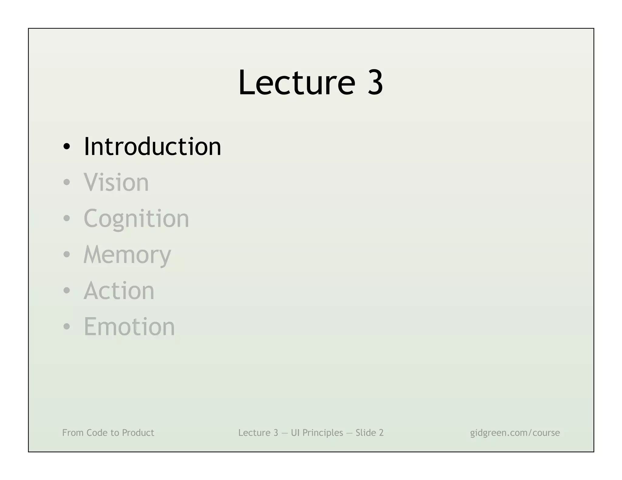 This document summarizes a lecture on user interface principles. It covers topics like vision, cognition, memory, action, and emotion as they relate to designing interfaces. Specific principles discussed include proximity, similarity, continuity, symmetry, structure, prominence, sequence, clutter, minimalism, affordances, mental models, metaphors, and direct manipulation. The goal is to design intuitive interfaces that are easy for users to understand and interact with.