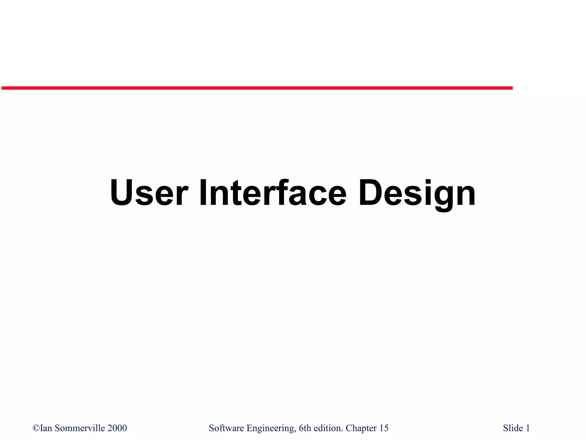 The document discusses user interface design principles for software systems, emphasizing the importance of usability and user-centered design. It covers various interaction styles, such as graphical user interfaces, menus, command languages, and natural language interfaces, along with their advantages and disadvantages. Key considerations include user guidance, message design, error handling, and the effective presentation of information to enhance user experience.