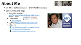 This document summarizes a presentation on user management in SharePoint Online. It begins with introductions and then outlines the agenda which includes understanding Office 365 licenses, examining a case study, and reviewing the proposed solution and tools. The case study involves automating the user registration and account creation process in Office 365 based on a registration form submission. This includes notifying admins and users via email. The challenges are that account creation and license assignment are not natively automated in Office 365. The proposed solution utilizes Windows PowerShell modules, SPServices, PeopleManager Services, and JSOM APIs to build the automated process.