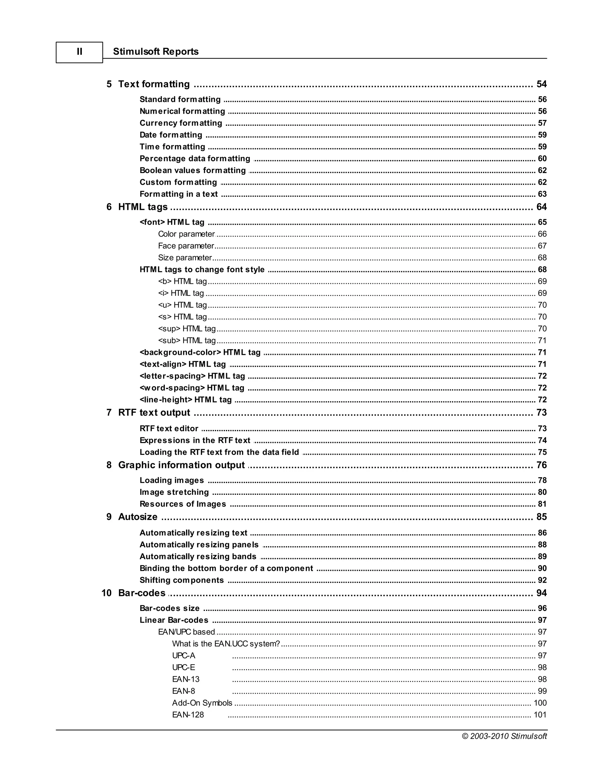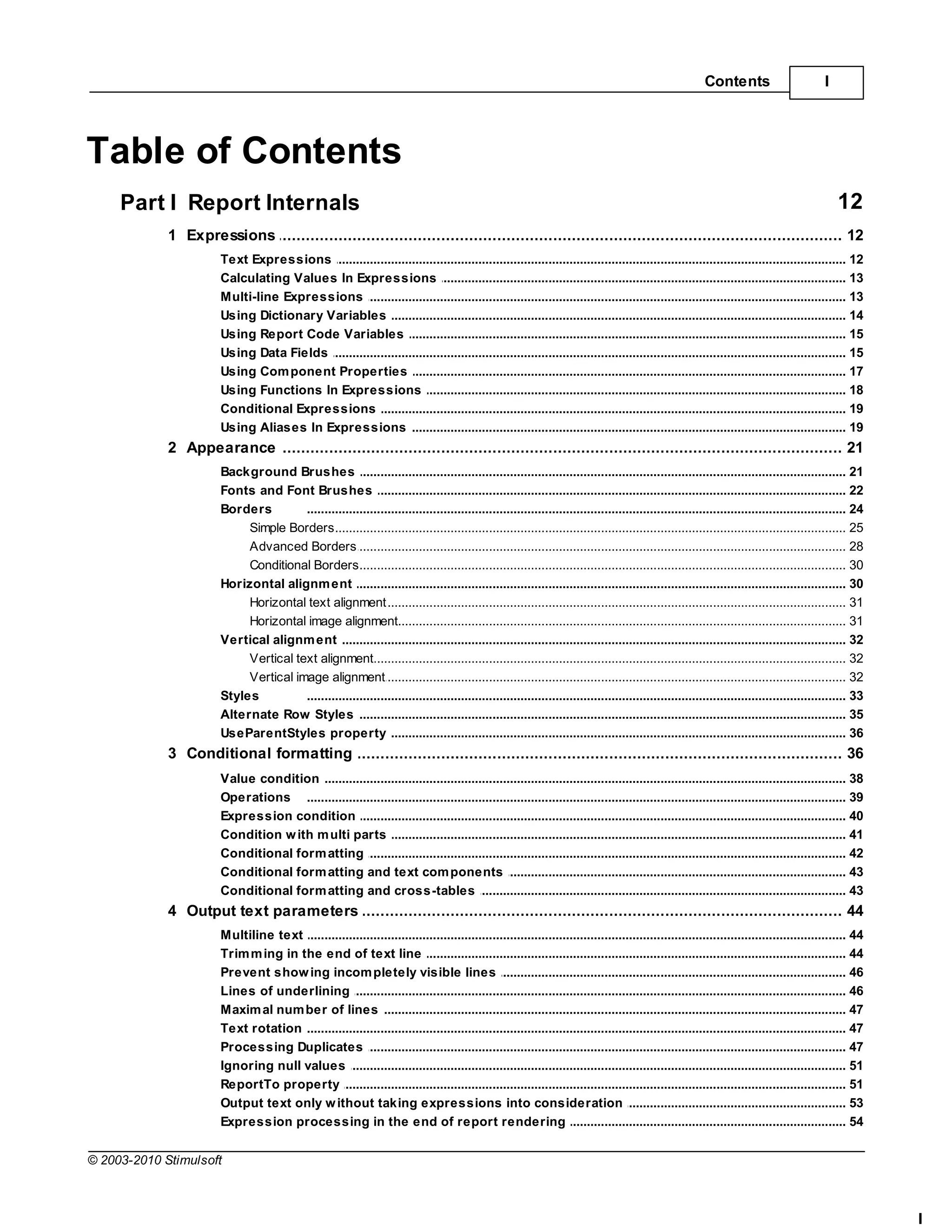 This document provides a table of contents for a report internals guide. The table of contents outlines topics related to expressions, appearance, conditional formatting, output text parameters, text formatting, HTML tags, RTF text, graphics, autosizing, barcodes, bands, lists, groups, page elements, columns, page numbering, empty bands, watermarks, panels, cross tables, and charts in reports. It provides a high-level overview of the structural and formatting elements that can be included in a report.