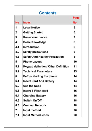 This document provides instructions on how to use a mobile phone. It discusses inserting SIM cards and batteries, using phone codes like PIN and PUK, charging the battery, and navigating menus. Safety precautions are also outlined, such as keeping the phone away from children and avoiding use in hazardous environments. Basic phone features like calling, texting and media playback are explained through the functions menu.