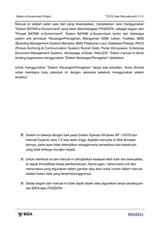 Sistem Pengelolaan Lahan Batam e-Government memungkinkan registrasi berbagai jenis permohonan lahan seperti alokasi lahan baru, pemecahan lahan, perubahan peruntukan lahan, dan lain-lain. Sistem ini juga mengelola proses evaluasi lahan, pengukuran lahan, penerbitan izin, pembayaran, serta monitoring illegal settler. Laporan statistik berbagai aktivitas dapat dicetak untuk keperluan analisis.