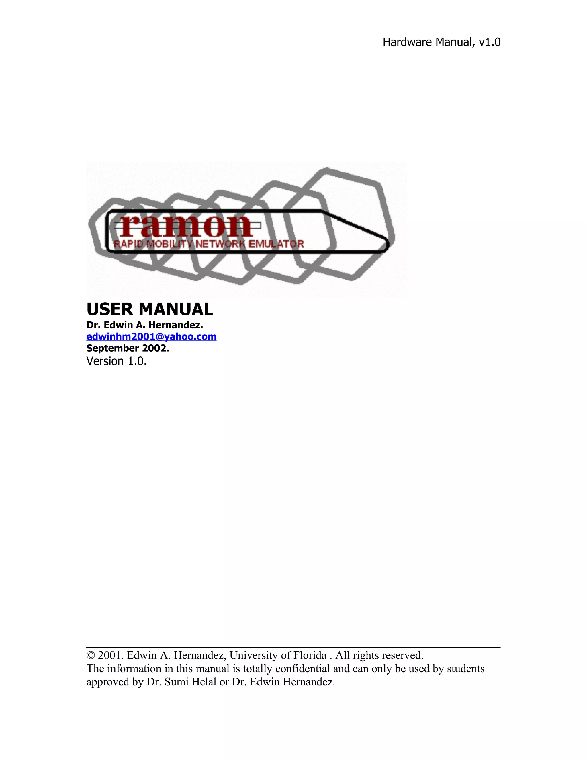 This document provides instructions for using RAMON, a network emulator with multiple PCs and embedded computers. It describes the IP addressing of the emulator machine and embedded devices. It also provides information on required software, usernames/passwords, and example emulation scripts to simulate network conditions between different nodes.
